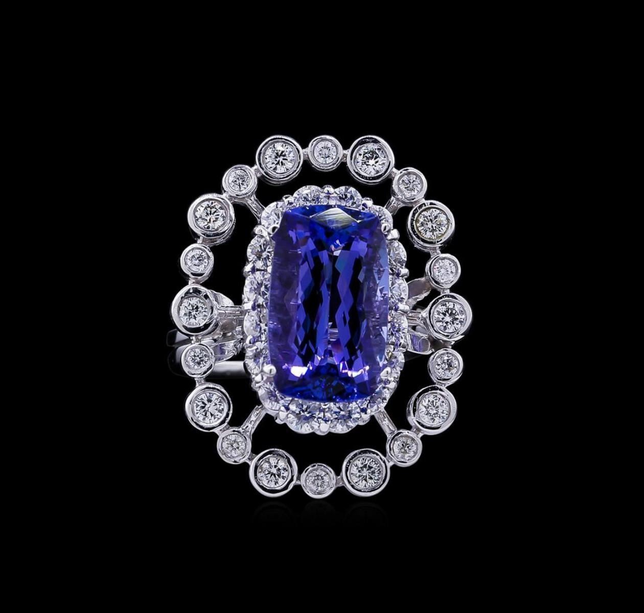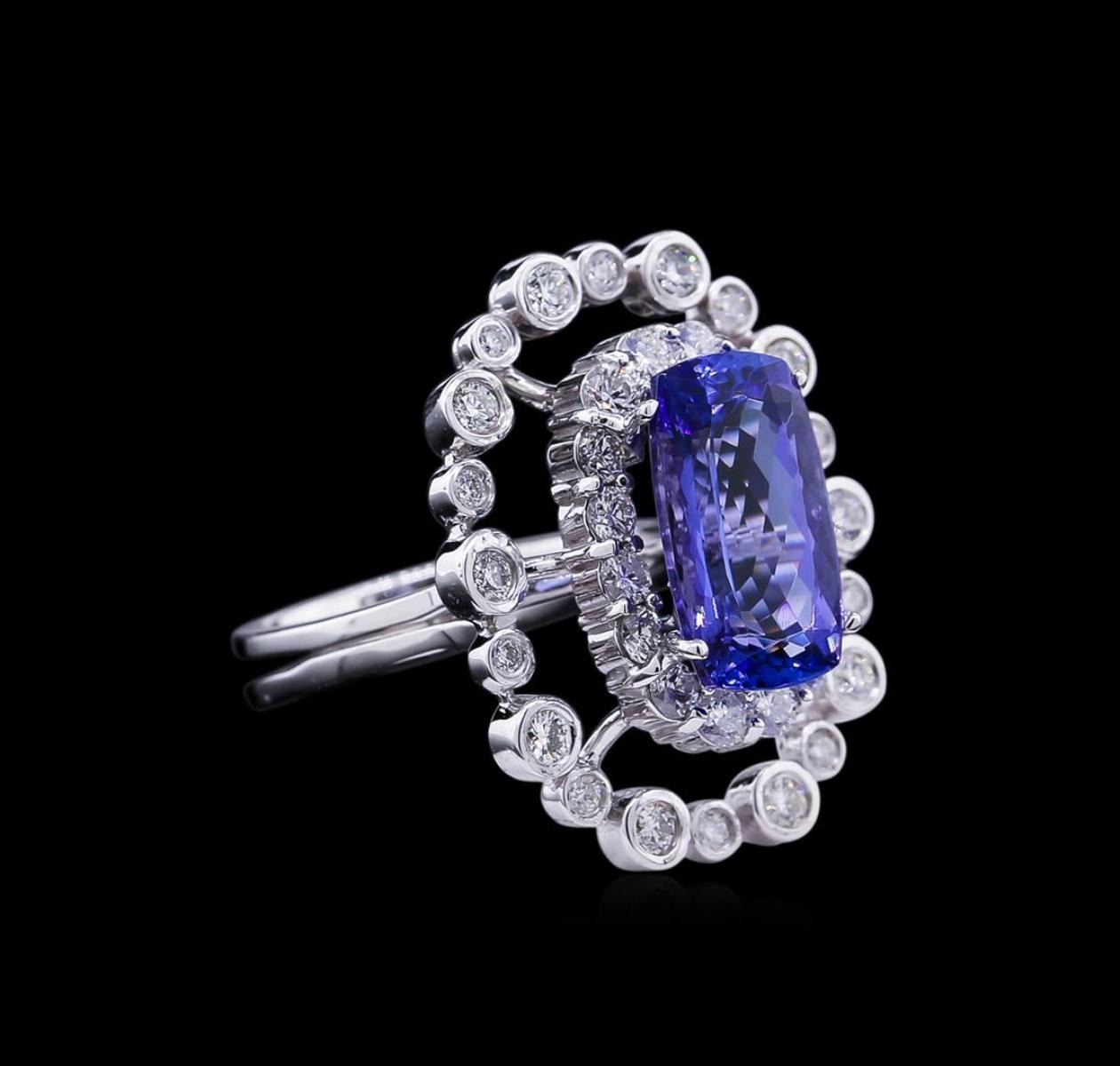 One electronically tested 14KT white gold lady's cast fashion ring with a double split shank with a bright polish finish. The featured lady's ring has a double shank measuring 3.84 millimeters wide. Identified with markings of "K14". Condition is new, good workmanship. Containing: One prong set rectangular cushion modified brilliant cut natural tanzanite, measuring 13.81 x 8.37 x 5.90mm, 10%. bulge factor, approximate weight of 5.87ct., clarity is eye clean, type I, medium, moderately strong, violetish blue color, (GIA vB 5/4), cut is very good. Transmitting light with no distortion, transparent. Colored gemstones are presumed to have been subjected to commonly used enhancement processes. Graded in the setting. Sixteen prong set round brilliant cut diamonds, measuring 2.50 - 2.40 x 1.47mm (depth est.) approximate total weight of 16 Stones = 0.86ct. Graded in the setting. Clarity: SI-1 to SI-2. Color: G - I. Cut Very Good Ten bezel set round brilliant cut diamonds, measuring 2.20 - 2.10 x 1.33mm (depth est.) approximate total weight of 10 Stones = 0.38ct. Graded in the setting. Clarity: SI-1 to SI-2. Color: G - Good Ten bezel set round brilliant cut diamonds, measuring 1.60 - 1.55 x 0.98mm (depth est.) approximate total weight of 10 Stones = 0.15ct. Graded in the setting. Clarity: SI-1 to I-1. Color: H - I. Cut Good. Total Weight of Colored Stones 5.87ct. Total Weight of Diamonds 1.39ct. Total Weight of Ring 8.60gm. GAS Appraised.