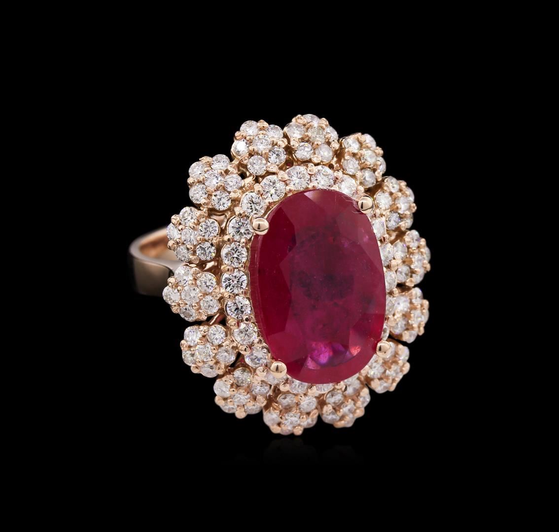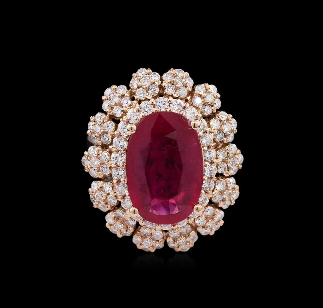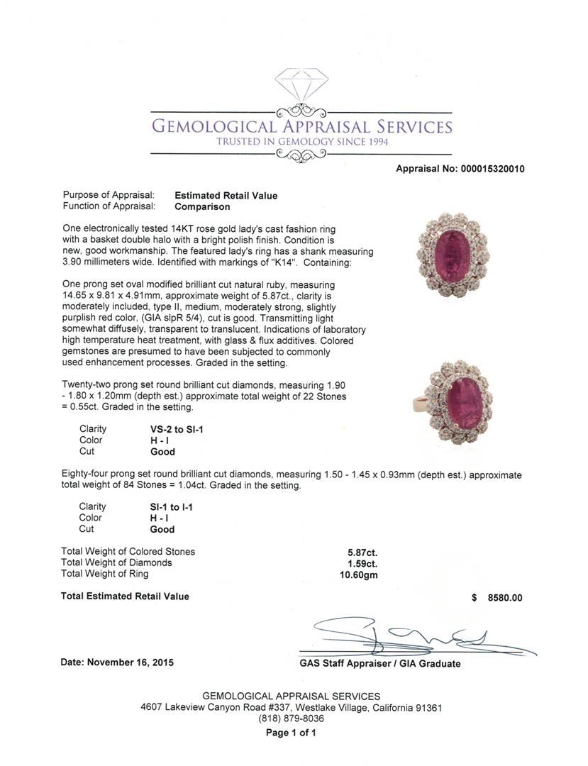 One electronically tested 14KT rose gold lady's cast fashion ring with a basket double halo with a bright polish finish. The featured lady's ring has a shank measuring 3.90 millimeters wide. Identified with markings of "K14". Condition is new, good workmanship. Containing: One prong set oval modified brilliant cut natural ruby, measuring 14.65 x 9.81 x 4.91mm, approximate weight of 5.87ct., clarity is moderately included, type II, medium, moderately strong, slightly purplish red color, (GIA slpR 5/4), cut is good. Transmitting light somewhat diffusely, transparent to translucent. Indications of laboratory high temperature heat treatment, with glass & flux additives. Colored gemstones are presumed to have been subjected to commonly used enhancement processes. Graded in the setting. Twenty-Two prong set round brilliant cut diamonds, measuring 1.90 - 1.80 x 1.20mm (depth est.) approximate total weight of 22 Stones = 0.55ct. Graded in the setting. Clarity: VS-2 to SI-1. Color: H - I. Cut Good Eighty-Four prong set round brilliant cut diamonds, measuring 1.50 - 1.45 x 0.93mm (depth est.) approximate total weight of 84 Stones = 1.04ct. Graded in the setting. Clarity: SI-1 to I-1. Color: H - I. Cut Good. Total Weight of Colored Stones 5.87ct. Total Weight of Diamonds 1.59ct. Total Weight of Ring 10.60gm. GAS Appraised at $8,580.00.