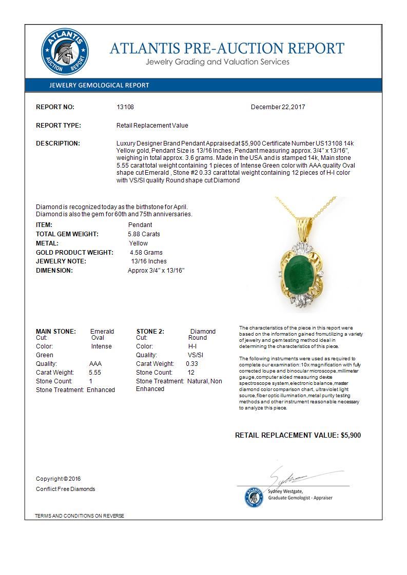 REF-89W3F -13108 ---- 5.88 CTW Emerald & Diamond Pendant 14K Yellow Gold ---- Luxury Designer Brand Pendant Appraised at $5,900 Certificate Number US13108 14k Yellow gold, Pendant Size is 13/16 Inches, Pendant measuring approx. 3/4" x 13/16", weighing in total approx. 3.6 grams. Made in the USA and is stamped 14k, Main stone 5.55 carat total weight containing 1 pieces of Intense Green color with AAA quality Oval shape cut Emerald , Stone #2 0.33 carat total weight containing 12 pieces of H-I color with VS/SI quality Round shape cut Diamond