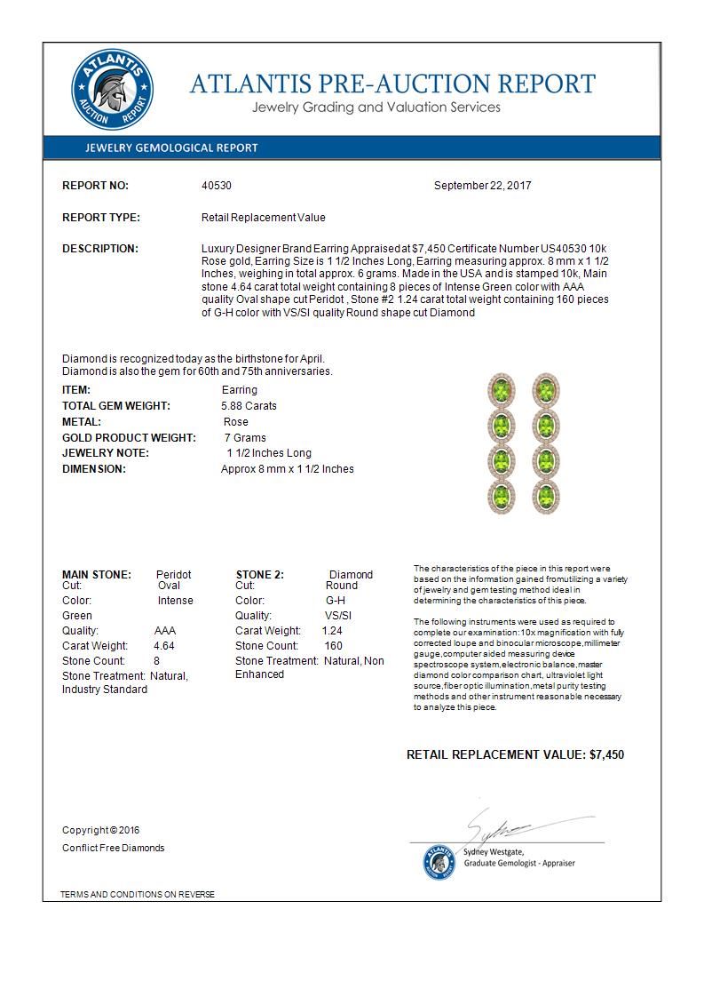 40530 - REF-112H5M ---- 5.88 CTW Peridot & Diamond Earrings Rose Gold 10K Rose Gold ---- Luxury Designer Brand Earring Appraised at $7,450 Certificate Number US40530 10k Rose gold, Earring Size is 1 1/2 Inches Long, Earring measuring approx. 8 mm x 1 1/2 Inches, weighing in total approx. 6 grams. Made in the USA and is stamped 10k, Main stone 4.64 carat total weight containing 8 pieces of Intense Green color with AAA quality Oval shape cut Peridot , Stone #2 1.24 carat total weight containing 160 pieces of G-H color with VS/SI quality Round shape cut Diamond