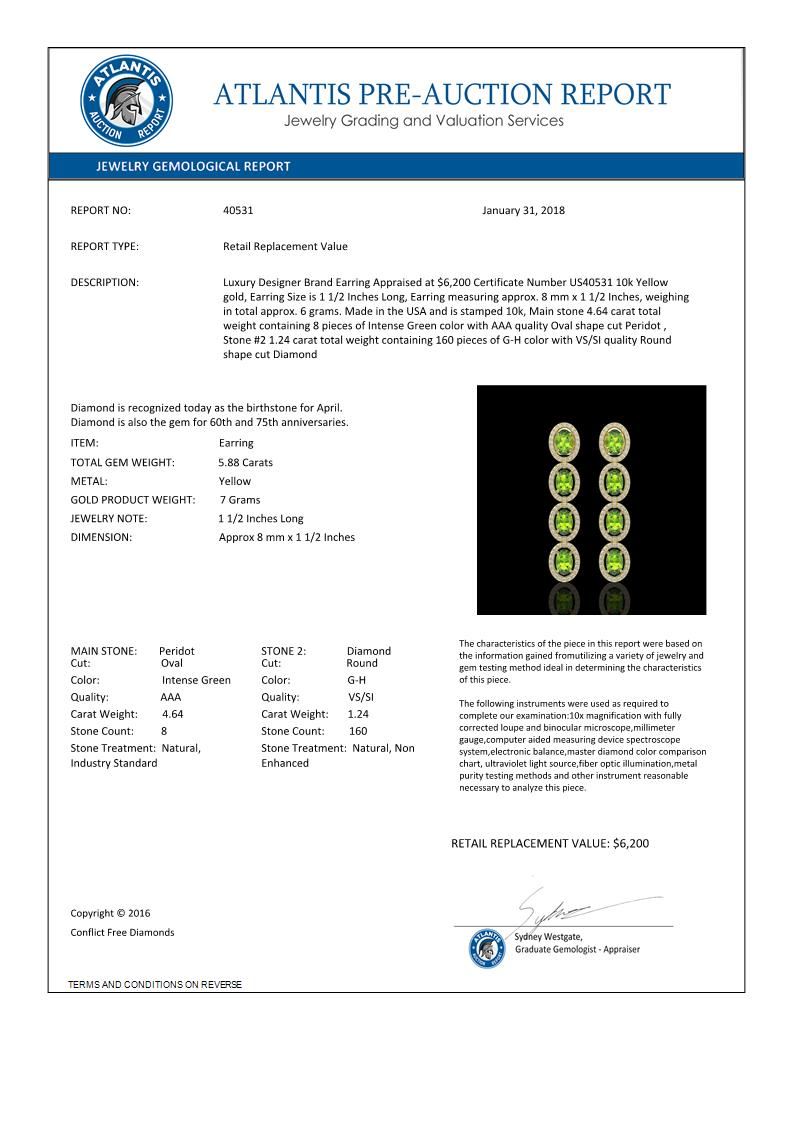 REF-112A5X -40531 ---- 5.88 CTW Peridot & Diamond Halo Earrings 10K Yellow Gold ---- Luxury Designer Brand Earring Appraised at $6,200 Certificate Number US40531 10k Yellow gold, Earring Size is 1 1/2 Inches Long, Earring measuring approx. 8 mm x 1 1/2 Inches, weighing in total approx. 6 grams. Made in the USA and is stamped 10k, Main stone 4.64 carat total weight containing 8 pieces of Intense Green color with AAA quality Oval shape cut Peridot , Stone #2 1.24 carat total weight containing 160 pieces of G-H color with VS/SI quality Round shape cut Diamond