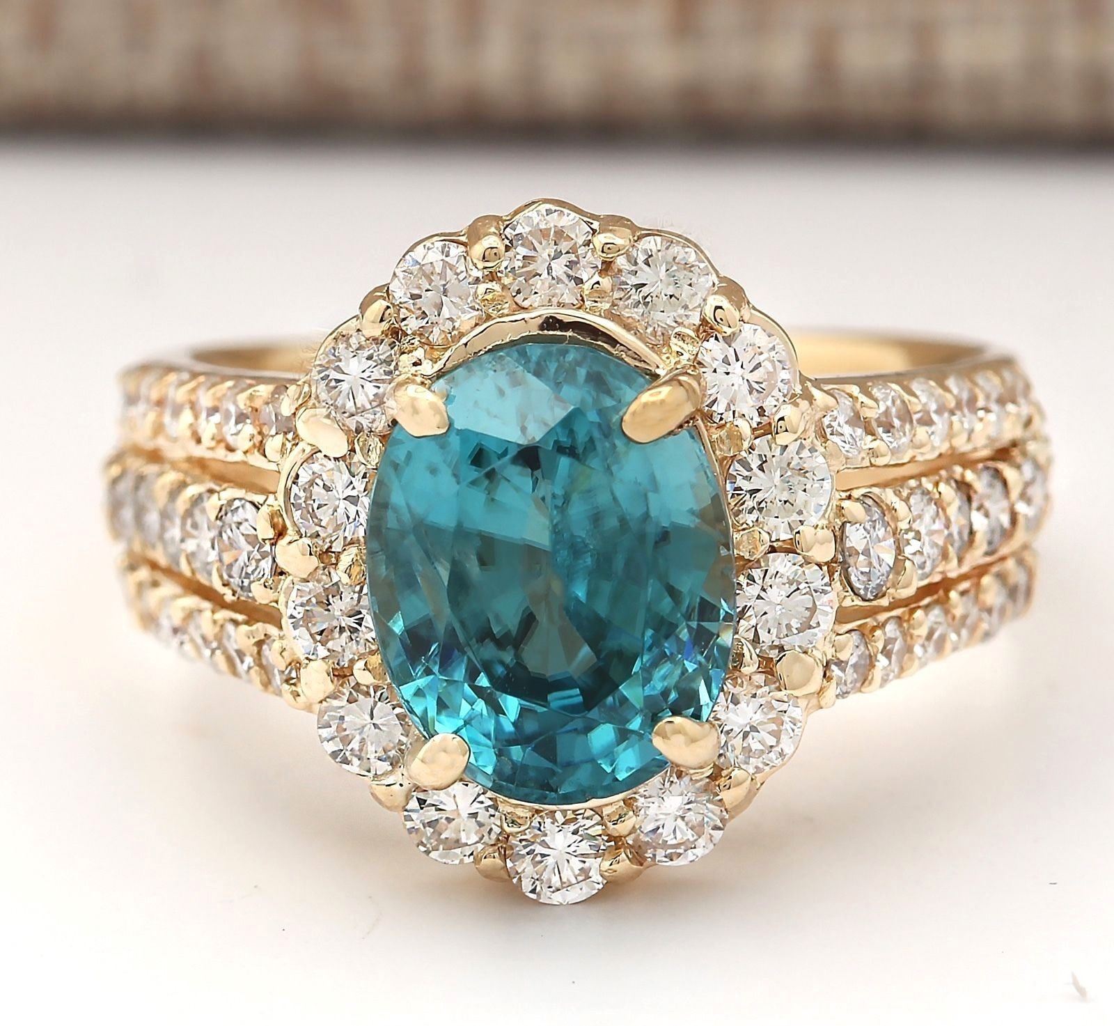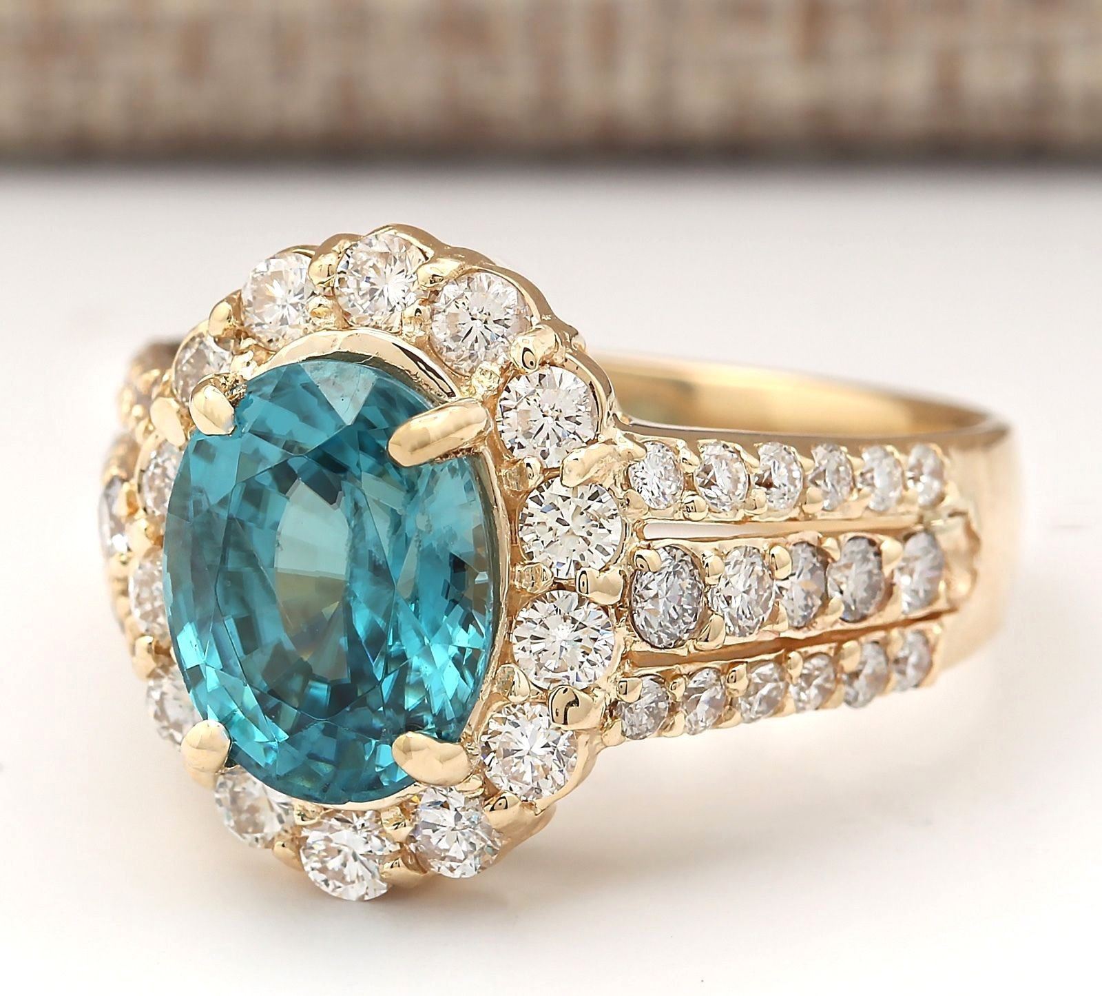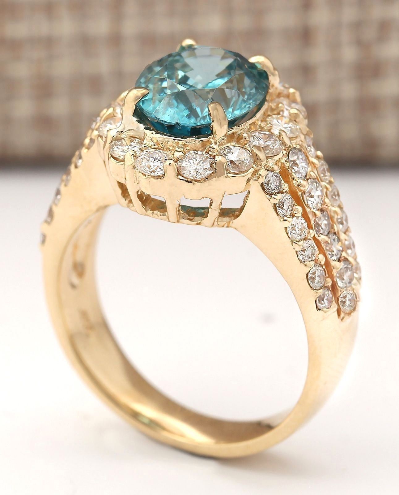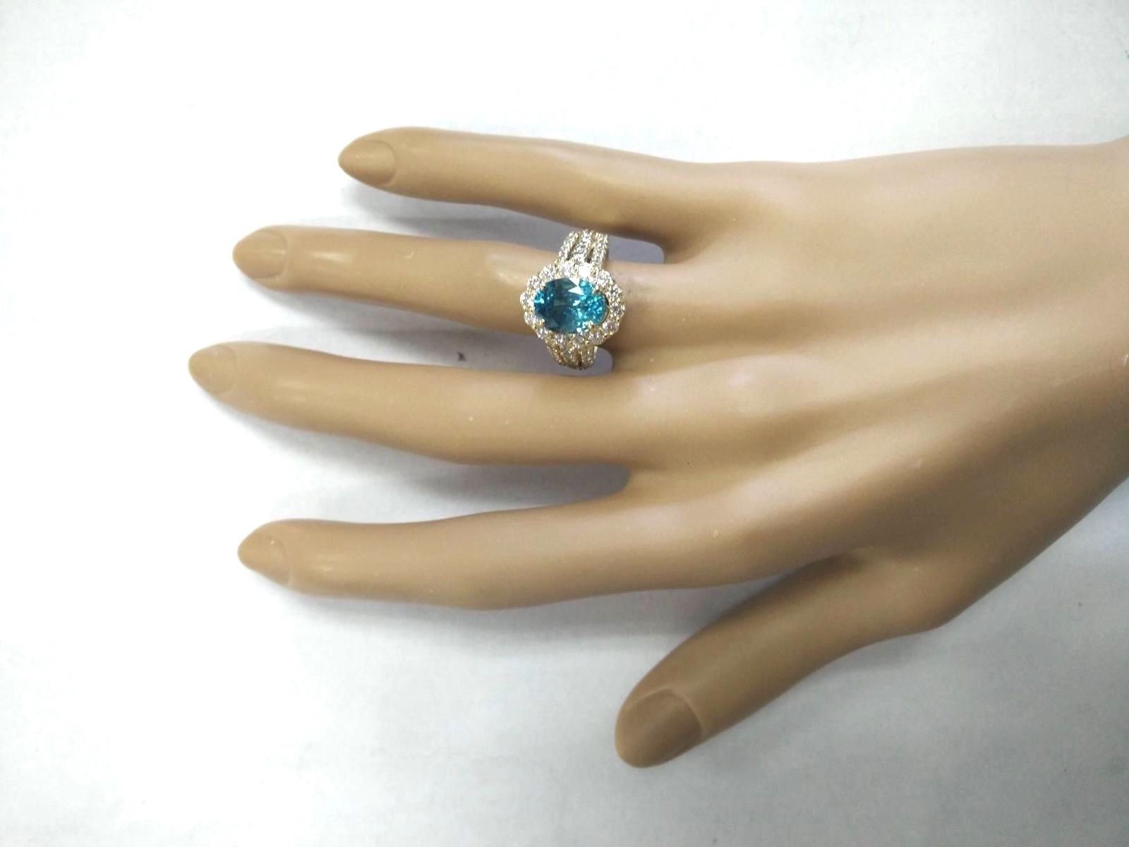 5.89 CTW Natural Blue Zircon And Diamond Ring 18K Solid Yellow Gold