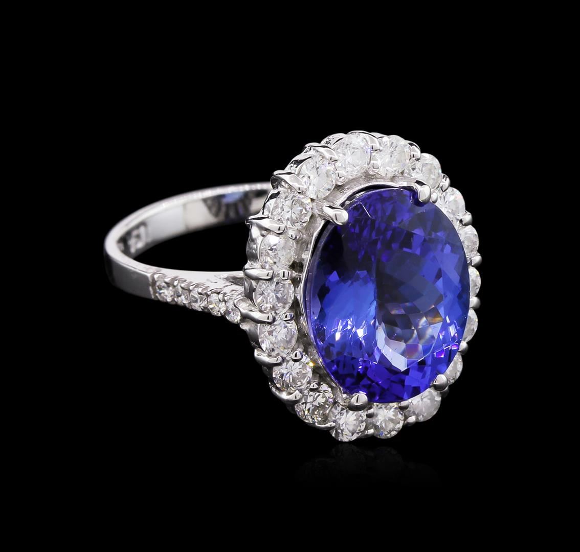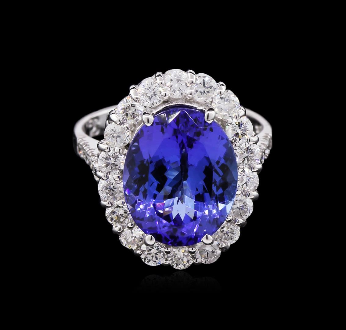 One polished, stamped, and tested 14K white gold ring mounted with: 1 genuine tanzanite center stone weighing 5.89 carat, and 28 genuine round diamonds weighing 1.19 carats. This item weighs 5.8 grams, condition is new, excellent workmanship. Main Gemstone: Identity: Natural Zoisite. Variety: Natural Tanzanite. Shape: Oval. Cutting Style: Modified Brilliant Cut. Measurements: 12.71 x 10.26 x 6.49 mm. Weight: 5.89 carat. Color Grade: Violetish Blue. Cut Grade: Very Good. Refractive Index: 1.691 - 1.700 DR. Birefringence: 0.008 - 0.013. Hardness: 6.5 - 7. Adjacent Gemstones On Ring: Identity: Natural Diamond. Shape: Round. Cutting Style: Brilliant Cut. Quantity: 28 Diamonds. Measurements: 1.6-2.8 mm. Total Weight: 1.19 crats. Clarity Grade: SI1-SI2. Color Grade: F-G. Refractive Index: 2.418. Hardness: 10. Tanzanite Weight: 5.89ct. Total Diamond Weight: 1.19cts. Weight Of Item: 5.8 grams. Gold Content: 14K White Gold. AIGL Appraised at $19,151.00.