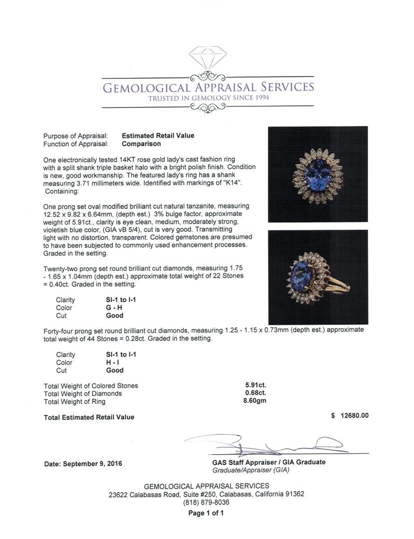 One electronically tested 14KT rose gold lady's cast fashion ring with a split shank triple basket halo with a bright polish finish. The featured lady's ring has a shank measuring 3.71 millimeters wide. Identified with markings of 'K14'. Condition is new, good workmanship. Containing: One prong set oval modified brilliant cut natural tanzanite, measuring 12.52 x 9.82 x 6.64mm, (depth est.) 3%. bulge factor, approximate weight of 5.91ct., clarity is eye clean, medium, moderately strong, violetish blue color, (GIA vB 5/4), cut is very good. Transmitting light with no distortion, transparent. Colored gemstones are presumed to have been subjected to commonly used enhancement processes. Graded in the setting. Twenty-Two prong set round brilliant cut diamonds, measuring 1.75 - 1.65 x 1.04mm (depth est.) approximate total weight of 22 Stones = 0.40ct. Graded in the setting. Clarity SI-1 to I-1. Color: G - H Cut Good Forty-Four prong set round brilliant cut diamonds, measuring 1.25 - 1.15 x 0.73mm (depth est.) approximate total weight of 44 Stones = 0.28ct. Graded in the setting. Clarity SI-1 to I-1. Color: H - I Cut Good. Total Weight of Colored Stones 5.91ct.. Total Weight of Diamonds 0.68ct.. Total Weight of Ring 8.60gm GAS Appraised at $12,680.00.