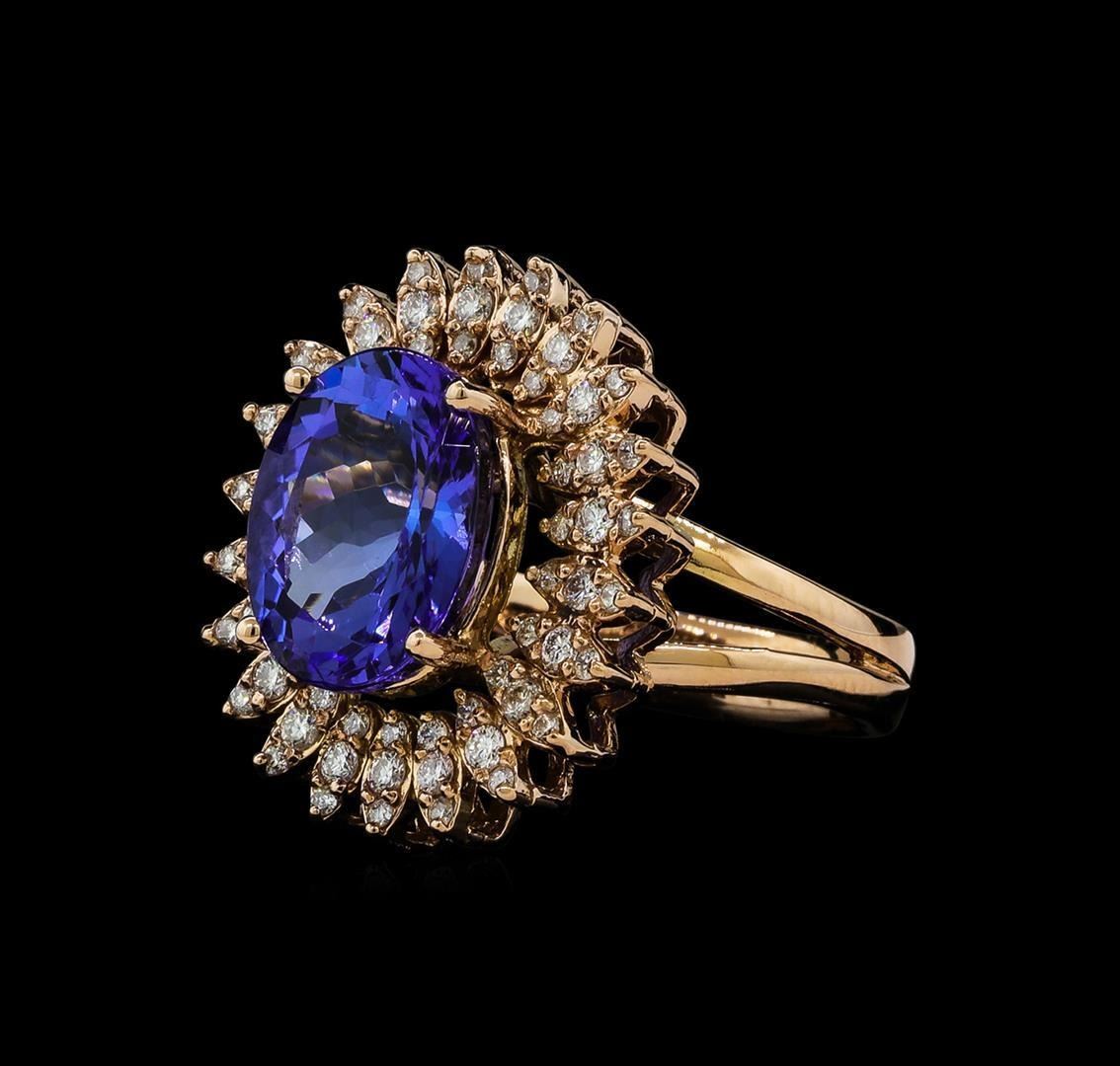 One electronically tested 14KT rose gold lady's cast fashion ring with a split shank triple basket halo with a bright polish finish. The featured lady's ring has a shank measuring 3.71 millimeters wide. Identified with markings of 'K14'. Condition is new, good workmanship. Containing: One prong set oval modified brilliant cut natural tanzanite, measuring 12.52 x 9.82 x 6.64mm, (depth est.) 3%. bulge factor, approximate weight of 5.91ct., clarity is eye clean, medium, moderately strong, violetish blue color, (GIA vB 5/4), cut is very good. Transmitting light with no distortion, transparent. Colored gemstones are presumed to have been subjected to commonly used enhancement processes. Graded in the setting. Twenty-Two prong set round brilliant cut diamonds, measuring 1.75 - 1.65 x 1.04mm (depth est.) approximate total weight of 22 Stones = 0.40ct. Graded in the setting. Clarity SI-1 to I-1. Color: G - H Cut Good Forty-Four prong set round brilliant cut diamonds, measuring 1.25 - 1.15 x 0.73mm (depth est.) approximate total weight of 44 Stones = 0.28ct. Graded in the setting. Clarity SI-1 to I-1. Color: H - I Cut Good. Total Weight of Colored Stones 5.91ct.. Total Weight of Diamonds 0.68ct.. Total Weight of Ring 8.60gm GAS Appraised.