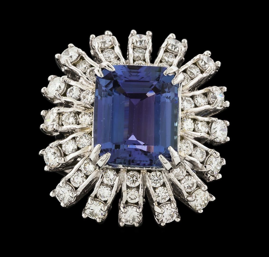One electronically tested 14KT white gold lady's cast fashion ring with a triple basket halo with a bright polish finish. The featured lady's ring has a shank measuring 2.66 millimeters wide. Identified with markings of 'K14'. Condition is new, good workmanship. Containing: One prong set emerald standard step cut natural tanzanite, measuring 11.74 x 9.63 x 5.85mm, (depth est.) approximate weight of 5.91ct., clarity is eye clean, medium light, moderately strong, violetish blue color, (GIA vB 4/4), cut is good. Transmitting light with no distortion, transparent. Colored gemstones are presumed to have been subjected to commonly used enhancement processes. Graded in the setting. Sixteen prong set round brilliant cut diamonds, measuring 2.60 - 2.50 x 1.58mm (depth est.) approximate total weight of 16 Stones = 1.00 ct. Graded in the setting. Clarity SI-1 to SI-2. Color: H - I Cut Good Thirty-Two channel set round brilliant cut diamonds, measuring 1.90 - 1.85 x 1.17mm (depth est.) approximate total weight of 32 Stones = 0.80 ct. Graded in the setting. Clarity SI-1 to SI-3. Color: H - I Cut Good. Total Weight of Colored Stones 5.91ct.. Total Weight of Diamonds 1.80 ct.. Total Weight of Ring 8.80gm. GAS Appraised.