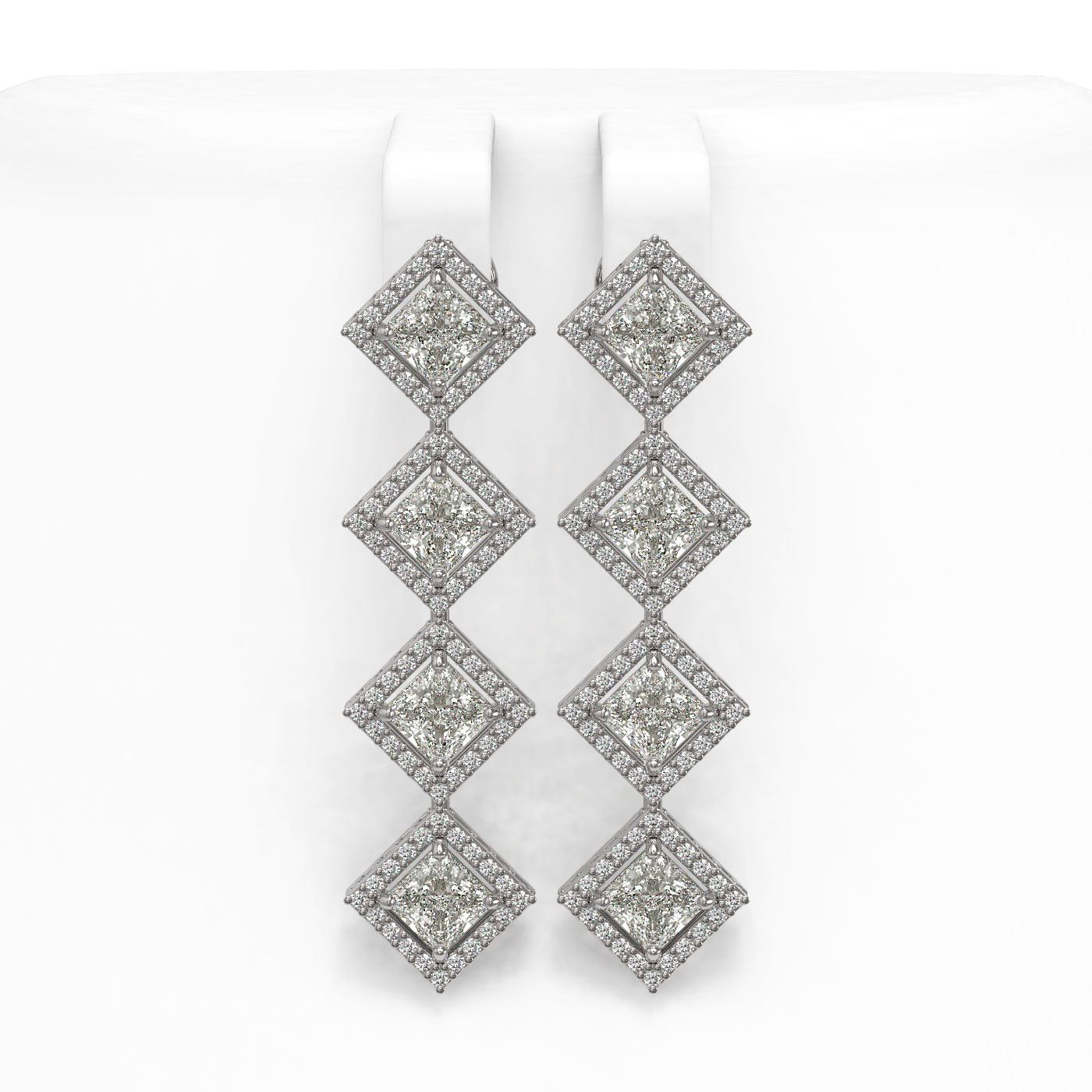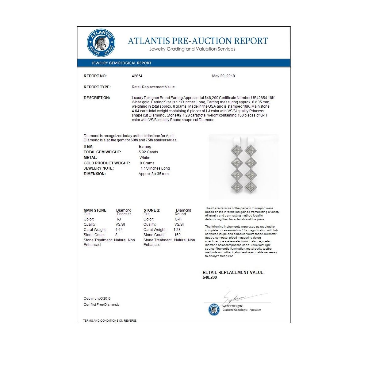 REF-1094Y9K -42854 ---- 5.92 CTW Princess Cut Diamond Designer Earrings 18K White Gold ---- Luxury Designer Brand Earring Appraised at $48,200 Certificate Number US42854 18K White gold, Earring Size is 1 1/3 Inches Long, Earring measuring approx. 8 x 35 mm, weighing in total approx. 8 grams. Made in the USA and is stamped 18K, Main stone 4.64 carat total weight containing 8 pieces of I-J color with VS/SI quality Princess shape cut Diamond , Stone #2 1.28 carat total weight containing 160 pieces of G-H color with VS/SI quality Round shape cut Diamond