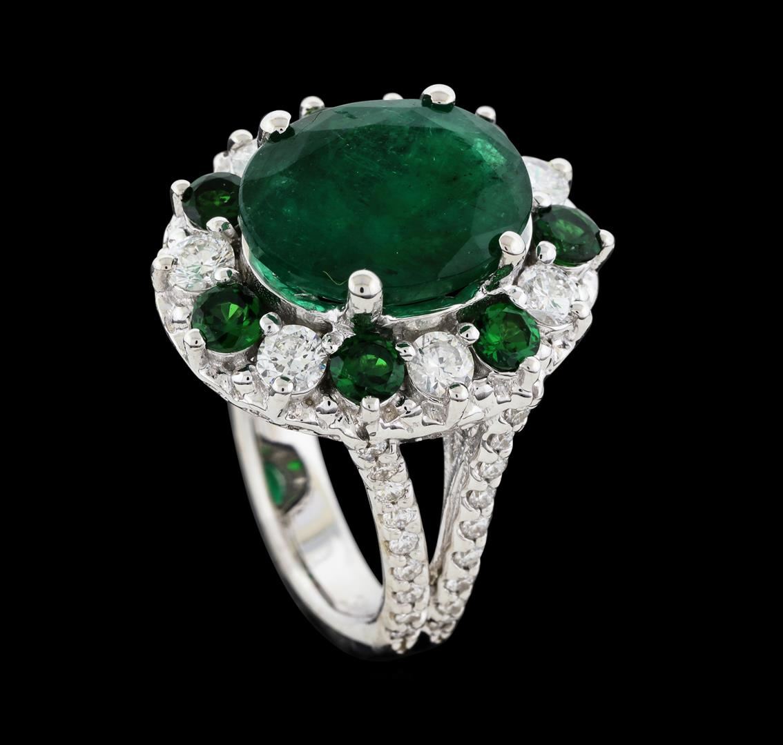 One electronically tested 14KT white gold lady's cast fashion ring with a split shank basket halo with a bright polish finish. The featured lady's ring has a double shank measuring 3.47 millimeters wide. Identified with markings of '14K'. Condition is new, good workmanship. Containing: One prong set oval modified mixed cut natural emerald, measuring 12.80 x 9.85 x 5.64mm, (depth est.) 15%. bulge factor, approximate weight of 5.00ct., clarity is heavily included, medium dark, moderately strong, green color, (GIA G 6/4), cut is good. Transmitting light somewhat diffusely, semi-transparent to translucent. Naturally occurring internal & external characteristics are present. Indications of oil residue. Colored gemstones are presumed to have been subjected to commonly used enhancement processes. Graded in the setting. Seven prong set round modified brilliant cut natural tsavorite garnets, measuring 3.05 - 2.95 x 1.95 mm, (depth est.) approximate total weight of 0.92ct., clarity is eye clean, medium dark, moderately strong, slightly yellowish green color, (GIA slyG 6/4), cut is good. Transmitting light with no distortion, transparent. Colored gemstones are presumed to have been subjected to commonly used enhancement processes. Graded in the setting. Seven prong set round brilliant cut diamonds, measuring 3.00 - 2.90 x 1.80mm (depth est.) approximate total weight of 7 Stones = 0.67ct. Graded in the setting. Clarity SI-2 to I-1. Color: G - H Cut Good Thirty-Six prong set round brilliant cut diamonds, measuring 1.40 - 1.35 x 0.86mm (depth est.) approximate total weight of 36 Stones = 0.36ct. Graded in the setting. Clarity SI-1 to SI-2. Color: H - I Cut Good. Total Weight of Colored Stones 5.92ct.. Total Weight of Diamonds 1.03ct.. Total Weight of Ring 9.60gm. GAS Appraised at $8,635.00.