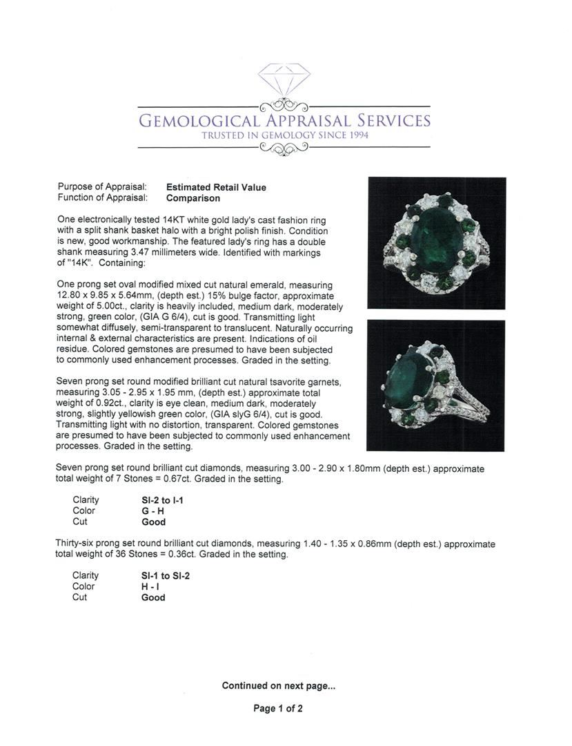 One electronically tested 14KT white gold lady's cast fashion ring with a split shank basket halo with a bright polish finish. The featured lady's ring has a double shank measuring 3.47 millimeters wide. Identified with markings of '14K'. Condition is new, good workmanship. Containing: One prong set oval modified mixed cut natural emerald, measuring 12.80 x 9.85 x 5.64mm, (depth est.) 15%. bulge factor, approximate weight of 5.00ct., clarity is heavily included, medium dark, moderately strong, green color, (GIA G 6/4), cut is good. Transmitting light somewhat diffusely, semi-transparent to translucent. Naturally occurring internal & external characteristics are present. Indications of oil residue. Colored gemstones are presumed to have been subjected to commonly used enhancement processes. Graded in the setting. Seven prong set round modified brilliant cut natural tsavorite garnets, measuring 3.05 - 2.95 x 1.95 mm, (depth est.) approximate total weight of 0.92ct., clarity is eye clean, medium dark, moderately strong, slightly yellowish green color, (GIA slyG 6/4), cut is good. Transmitting light with no distortion, transparent. Colored gemstones are presumed to have been subjected to commonly used enhancement processes. Graded in the setting. Seven prong set round brilliant cut diamonds, measuring 3.00 - 2.90 x 1.80mm (depth est.) approximate total weight of 7 Stones = 0.67ct. Graded in the setting. Clarity SI-2 to I-1. Color: G - H Cut Good Thirty-Six prong set round brilliant cut diamonds, measuring 1.40 - 1.35 x 0.86mm (depth est.) approximate total weight of 36 Stones = 0.36ct. Graded in the setting. Clarity SI-1 to SI-2. Color: H - I Cut Good. Total Weight of Colored Stones 5.92ct.. Total Weight of Diamonds 1.03ct.. Total Weight of Ring 9.60gm. GAS Appraised at $8,635.00.
