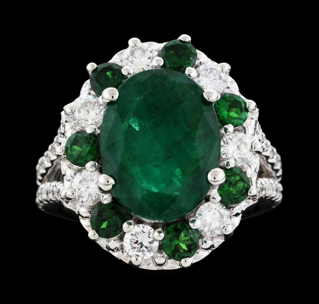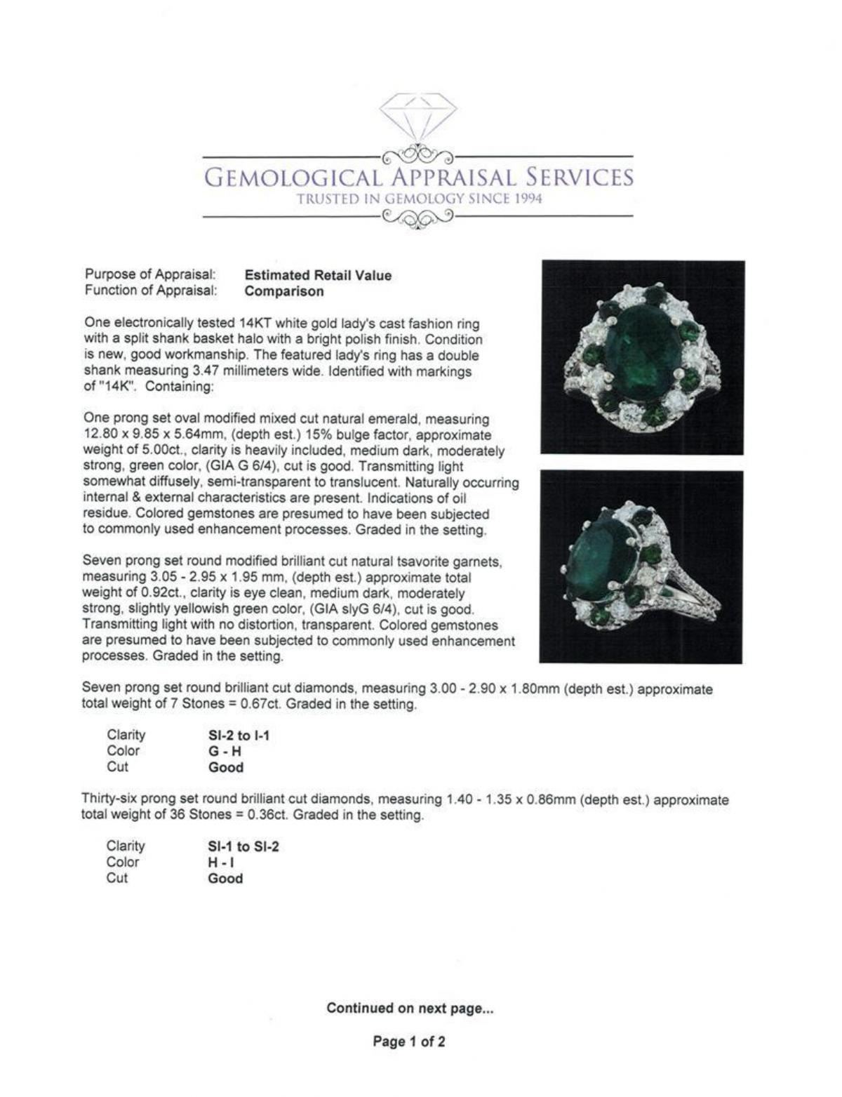 One electronically tested 14KT white gold lady's cast fashion ring with a split shank basket halo with a bright polish finish. The featured lady's ring has a double shank measuring 3.47 millimeters wide. Identified with markings of '14K'. Condition is new, good workmanship. Containing: One prong set oval modified mixed cut natural emerald, measuring 12.80 x 9.85 x 5.64mm, (depth est.) 15%. bulge factor, approximate weight of 5.00ct., clarity is heavily included, medium dark, moderately strong, green color, (GIA G 6/4), cut is good. Transmitting light somewhat diffusely, semi-transparent to translucent. Naturally occurring internal & external characteristics are present. Indications of oil residue. Colored gemstones are presumed to have been subjected to commonly used enhancement processes. Graded in the setting. Seven prong set round modified brilliant cut natural tsavorite garnets, measuring 3.05 - 2.95 x 1.95 mm, (depth est.) approximate total weight of 0.92ct., clarity is eye clean, medium dark, moderately strong, slightly yellowish green color, (GIA slyG 6/4), cut is good. Transmitting light with no distortion, transparent. Colored gemstones are presumed to have been subjected to commonly used enhancement processes. Graded in the setting. Seven prong set round brilliant cut diamonds, measuring 3.00 - 2.90 x 1.80mm (depth est.) approximate total weight of 7 Stones = 0.67ct. Graded in the setting. Clarity SI-2 to I-1. Color: G - H Cut Good Thirty-Six prong set round brilliant cut diamonds, measuring 1.40 - 1.35 x 0.86mm (depth est.) approximate total weight of 36 Stones = 0.36ct. Graded in the setting. Clarity SI-1 to SI-2. Color: H - I Cut Good. Total Weight of Colored Stones 5.92ct.. Total Weight of Diamonds 1.03ct.. Total Weight of Ring 9.60gm. GAS Appraised.