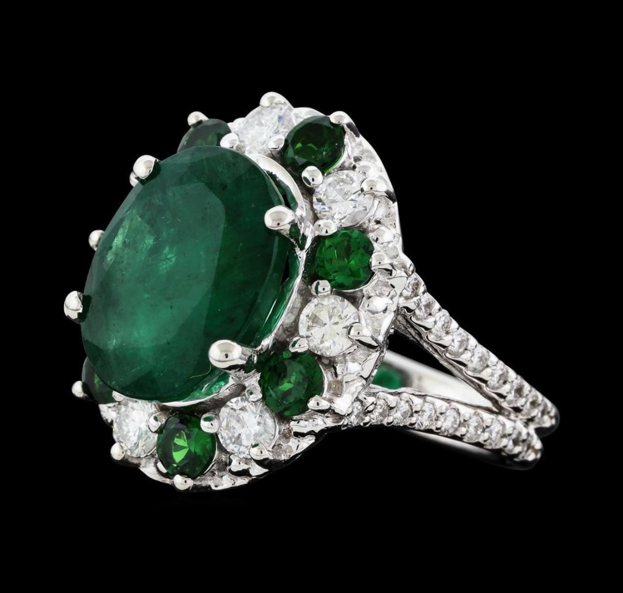 One electronically tested 14KT white gold lady's cast fashion ring with a split shank basket halo with a bright polish finish. The featured lady's ring has a double shank measuring 3.47 millimeters wide. Identified with markings of '14K'. Condition is new, good workmanship. Containing: One prong set oval modified mixed cut natural emerald, measuring 12.80 x 9.85 x 5.64mm, (depth est.) 15%. bulge factor, approximate weight of 5.00ct., clarity is heavily included, medium dark, moderately strong, green color, (GIA G 6/4), cut is good. Transmitting light somewhat diffusely, semi-transparent to translucent. Naturally occurring internal & external characteristics are present. Indications of oil residue. Colored gemstones are presumed to have been subjected to commonly used enhancement processes. Graded in the setting. Seven prong set round modified brilliant cut natural tsavorite garnets, measuring 3.05 - 2.95 x 1.95 mm, (depth est.) approximate total weight of 0.92ct., clarity is eye clean, medium dark, moderately strong, slightly yellowish green color, (GIA slyG 6/4), cut is good. Transmitting light with no distortion, transparent. Colored gemstones are presumed to have been subjected to commonly used enhancement processes. Graded in the setting. Seven prong set round brilliant cut diamonds, measuring 3.00 - 2.90 x 1.80mm (depth est.) approximate total weight of 7 Stones = 0.67ct. Graded in the setting. Clarity SI-2 to I-1. Color: G - H Cut Good Thirty-Six prong set round brilliant cut diamonds, measuring 1.40 - 1.35 x 0.86mm (depth est.) approximate total weight of 36 Stones = 0.36ct. Graded in the setting. Clarity SI-1 to SI-2. Color: H - I Cut Good. Total Weight of Colored Stones 5.92ct.. Total Weight of Diamonds 1.03ct.. Total Weight of Ring 9.60gm. GAS Appraised.