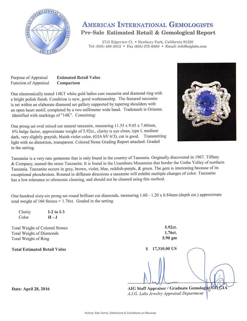 One electronically tested 14KT white gold ladies cast tanzanite and diamond ring with a bright polish finish. The featured tanzanite is set within an elaborate diamond set gallery supported by tapering shoulders with an open heart motif, completed by a two millimeter wide band. Trademark is Orianne. Identified with markings of "14K". Condition is new, good workmanship. Containing: One prong set oval mixed cut natural tanzanite, measuring 11.55 x 9.05 x 7.60mm, 6%. bulge factor, approximate weight of 5.92ct., clarity is eye clean, type I, medium dark, very slightly grayish, bluish violet color, (GIA bV 6/3), cut is good. Transmitting light with no distortion, transparent. Colored Stone Grading Report attached. Graded in the setting. Tanzanite is a very rare gemstone that is only found in the country of Tanzania. Originally discovered in 1967. Tiffany & Company, named the stone Tanzanite. It is found in the Usumburu Mountains that border the Umba Valley of northern Tanzania. Tanzanite occurs in gray, brown, violet, blue, reddish-purple, & green. The gem is interesting because of its exceptional pleochroism. Rotated in different directions a tanzanite will exhibit multiple changes of color. Tanzanite has a low tolerance to ultrasonic cleaning, and should not be cleaned using this method. One Hundred Sixty-Six prong set round brilliant cut diamonds, measuring 1.60 - 1.20 x 0.84mm (depth est.) approximate total weight of 166 Stones = 1.76ct. Graded in the setting. Clarity: I-2 to I-3. Color: H - J. Total Weight of Colored Stones 5.92ct. Total Weight of Diamonds 1.76ct. Total Weight of Ring 5.90gm. AIG Appraised at $17,310.00.
