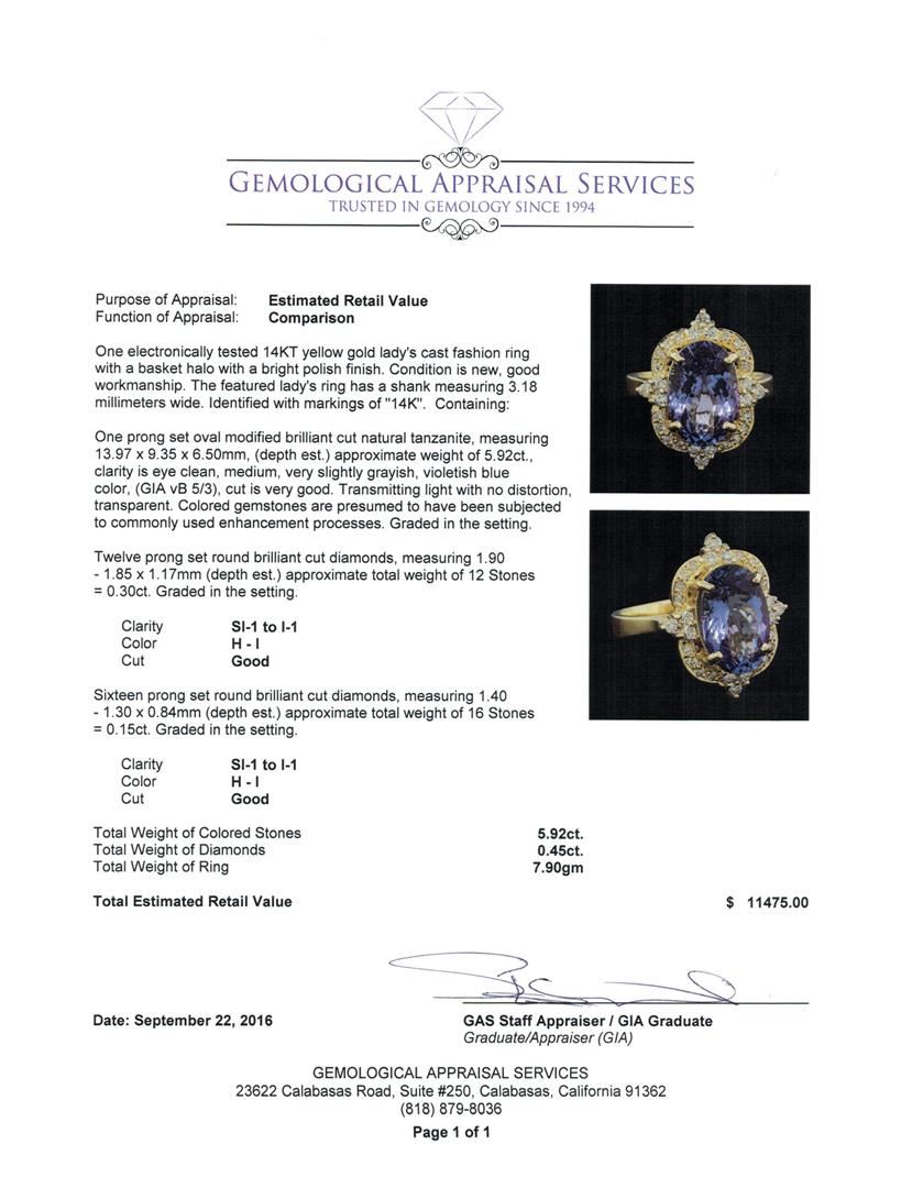 One electronically tested 14KT yellow gold lady's cast fashion ring with a basket halo with a bright polish finish. The featured lady's ring has a shank measuring 3.18 millimeters wide. Identified with markings of '14K'. Condition is new, good workmanship. Containing: One prong set oval modified brilliant cut natural tanzanite, measuring 13.97 x 9.35 x 6.50mm, (depth est.) approximate weight of 5.92ct., clarity is eye clean, medium, very slightly grayish, violetish blue color, (GIA vB 5/3), cut is very good. Transmitting light with no distortion, transparent. Colored gemstones are presumed to have been subjected to commonly used enhancement processes. Graded in the setting. Twelve prong set round brilliant cut diamonds, measuring 1.90 - 1.85 x 1.17mm (depth est.) approximate total weight of 12 Stones = 0.30ct. Graded in the setting. Clarity SI-1 to I-1. Color: H - I Cut Good Sixteen prong set round brilliant cut diamonds, measuring 1.40 - 1.30 x 0.84mm (depth est.) approximate total weight of 16 Stones = 0.15ct. Graded in the setting. Clarity SI-1 to I-1. Color: H - I Cut Good. Total Weight of Colored Stones 5.92ct.. Total Weight of Diamonds 0.45ct.. Total Weight of Ring 7.90gm. GAS Appraised at $11,475.00.