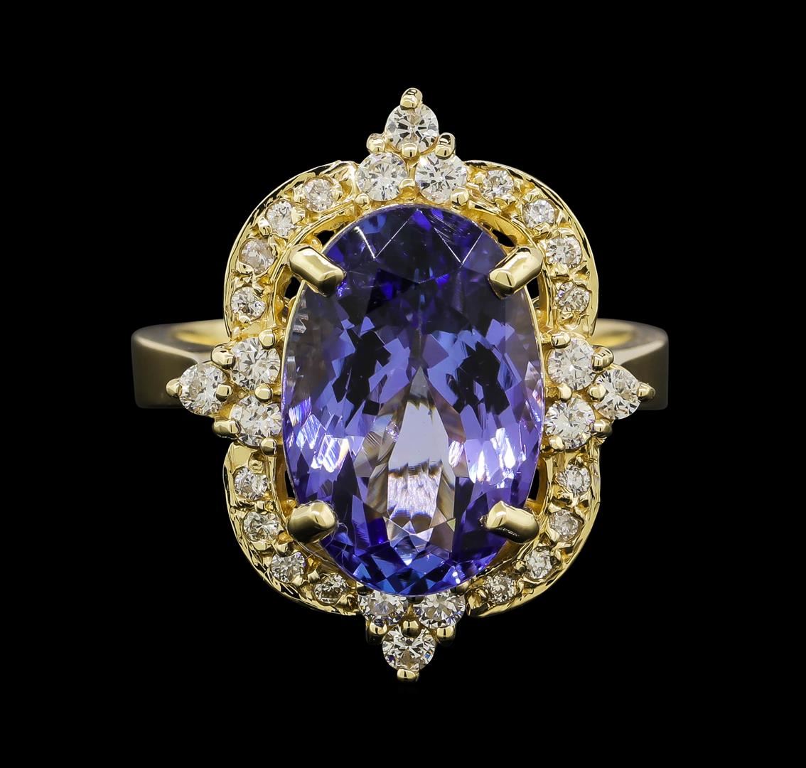 One electronically tested 14KT yellow gold lady's cast fashion ring with a basket halo with a bright polish finish. The featured lady's ring has a shank measuring 3.18 millimeters wide. Identified with markings of '14K'. Condition is new, good workmanship. Containing: One prong set oval modified brilliant cut natural tanzanite, measuring 13.97 x 9.35 x 6.50mm, (depth est.) approximate weight of 5.92ct., clarity is eye clean, medium, very slightly grayish, violetish blue color, (GIA vB 5/3), cut is very good. Transmitting light with no distortion, transparent. Colored gemstones are presumed to have been subjected to commonly used enhancement processes. Graded in the setting. Twelve prong set round brilliant cut diamonds, measuring 1.90 - 1.85 x 1.17mm (depth est.) approximate total weight of 12 Stones = 0.30ct. Graded in the setting. Clarity SI-1 to I-1. Color: H - I Cut Good Sixteen prong set round brilliant cut diamonds, measuring 1.40 - 1.30 x 0.84mm (depth est.) approximate total weight of 16 Stones = 0.15ct. Graded in the setting. Clarity SI-1 to I-1. Color: H - I Cut Good. Total Weight of Colored Stones 5.92ct.. Total Weight of Diamonds 0.45ct.. Total Weight of Ring 7.90gm. GAS Appraised at $11,475.00.