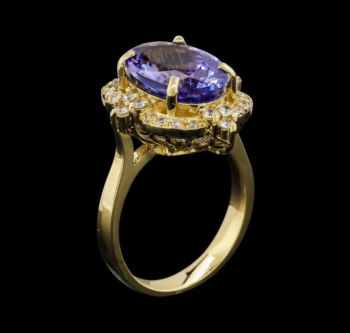 One electronically tested 14KT yellow gold lady's cast fashion ring with a basket halo with a bright polish finish. The featured lady's ring has a shank measuring 3.18 millimeters wide. Identified with markings of '14K'. Condition is new, good workmanship. Containing: One prong set oval modified brilliant cut natural tanzanite, measuring 13.97 x 9.35 x 6.50mm, (depth est.) approximate weight of 5.92ct., clarity is eye clean, medium, very slightly grayish, violetish blue color, (GIA vB 5/3), cut is very good. Transmitting light with no distortion, transparent. Colored gemstones are presumed to have been subjected to commonly used enhancement processes. Graded in the setting. Twelve prong set round brilliant cut diamonds, measuring 1.90 - 1.85 x 1.17mm (depth est.) approximate total weight of 12 Stones = 0.30ct. Graded in the setting. Clarity SI-1 to I-1. Color: H - I Cut Good Sixteen prong set round brilliant cut diamonds, measuring 1.40 - 1.30 x 0.84mm (depth est.) approximate total weight of 16 Stones = 0.15ct. Graded in the setting. Clarity SI-1 to I-1. Color: H - I Cut Good. Total Weight of Colored Stones 5.92ct.. Total Weight of Diamonds 0.45ct.. Total Weight of Ring 7.90gm. GAS Appraised at $11,475.00.