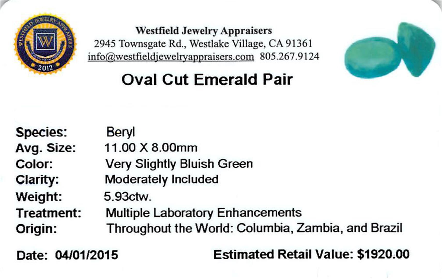 Two oval mixed cut natural emeralds exact total weight 5.93ct., clarity is moderately included, type III, medium dark, very slightly grayish, very slightly bluish green color, (GIA vslbG 6/3), cut is good. Westfield Appraised.