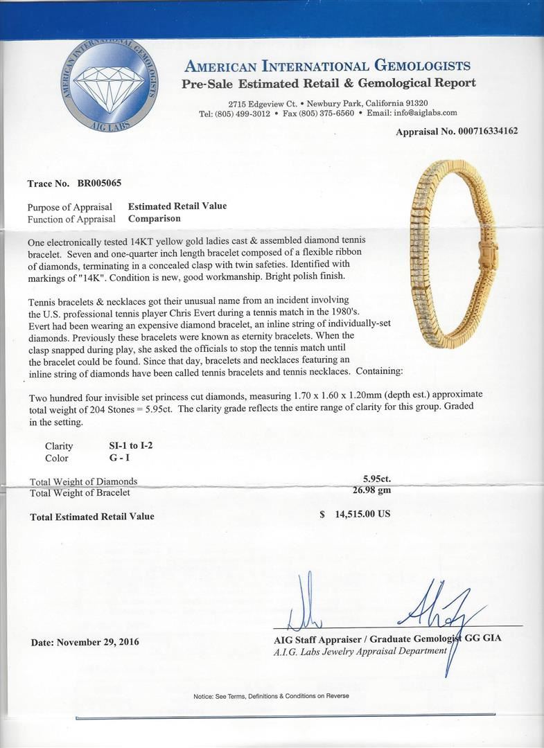 One 5.95ctw Diamond Bracelet - 14KT Yellow Gold. AIG certified. See Appraisal for more details. AIG Appraised.