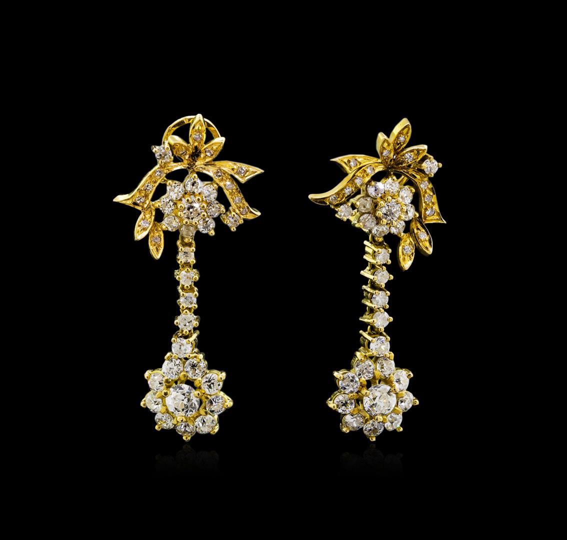One pair electronically tested 18KT yellow gold lady's combination cast & assembled dangle flower design earrings with Omega clip backs with posts with a bright polish finish. Condition is used, good workmanship. Containing: Two prong set Old European cut diamonds, measuring 5.25 - 5.20 x 3.66mm (depth est.) approximate total weight of 2 Stones = 1.25ct. Graded in the setting. Clarity: VS-1 to VS-2. Color: F - Good Fifty prong set old mine cut diamonds, measuring 3.20 - 2.50 x 1.77mm (depth est.) approximate total weight of 50 Stones = 4.40ct. Graded in the setting. Clarity: VS-1 to I-1. Color: F - I. Cut Fair Twenty-Six bead set single cut diamonds, measuring 1.50 - 1.40 x 0.87mm (depth est.) approximate total weight of 26 Stones = 0.30ct. Graded in the setting. Clarity: SI-1 to I-1. Color: G - I. Cut Good. Total Weight of Diamonds 5.95ct. Total Weight of Earrings 17.50gm. GAS Appraised at $16,960.00.