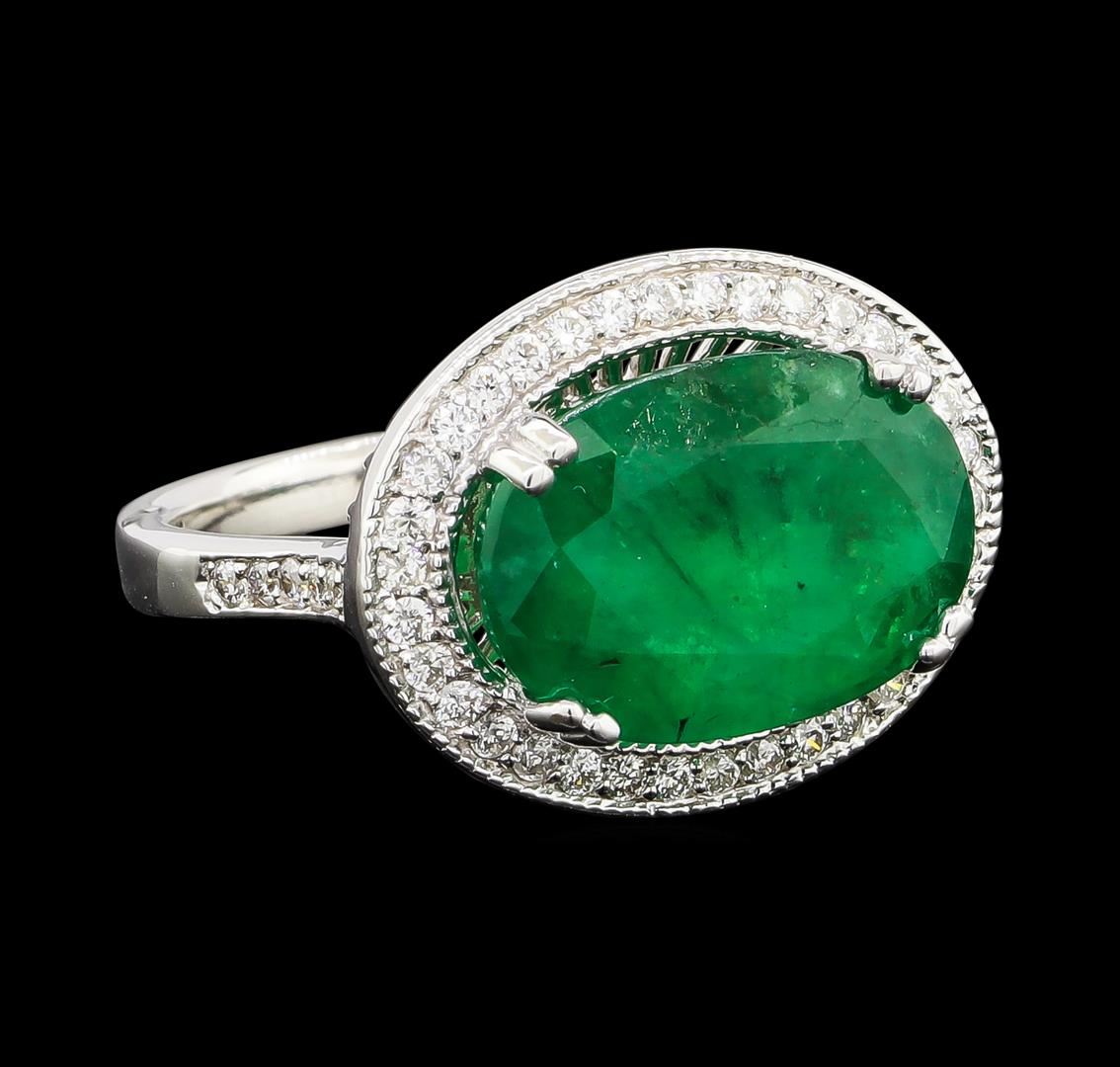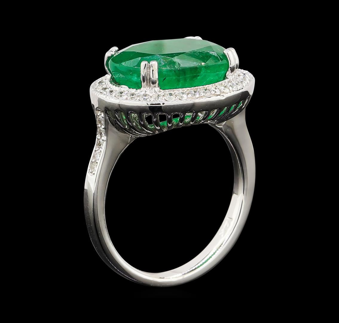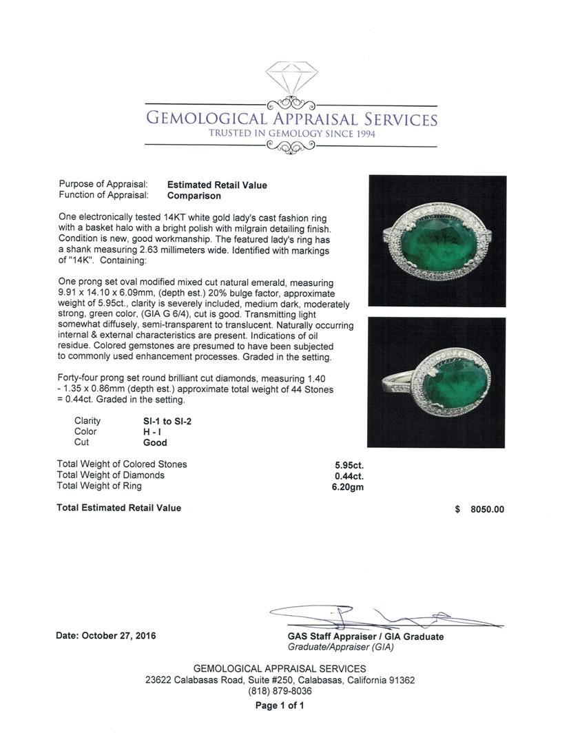 One electronically tested 14KT white gold lady's cast fashion ring with a basket halo with a bright polish with milgrain detailing finish. The featured lady's ring has a shank measuring 2.63 millimeters wide. Identified with markings of '14K'. Condition is new, good workmanship. Containing: One prong set oval modified mixed cut natural emerald, measuring 9.91 x 14.10 x 6.09mm, (depth est.) 20%. bulge factor, approximate weight of 5.95ct., clarity is severely included, medium dark, moderately strong, green color, (GIA G 6/4), cut is good. Transmitting light somewhat diffusely, semi-transparent to translucent. Naturally occurring internal & external characteristics are present. Indications of oil residue. Colored gemstones are presumed to have been subjected to commonly used enhancement processes. Graded in the setting. Forty-Four prong set round brilliant cut diamonds, measuring 1.40 - 1.35 x 0.86mm (depth est.) approximate total weight of 44 Stones = 0.44ct. Graded in the setting. Clarity SI-1 to SI-2. Color: H - I Cut Good. Total Weight of Colored Stones 5.95ct.. Total Weight of Diamonds 0.44ct.. Total Weight of Ring 6.20gm. GAS Appraised at $8,050.00.