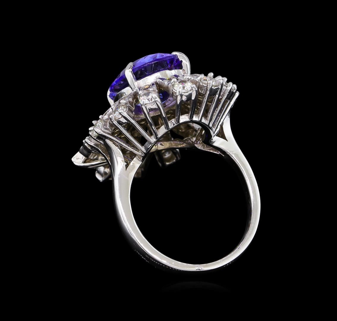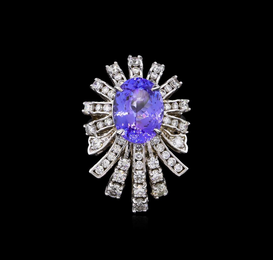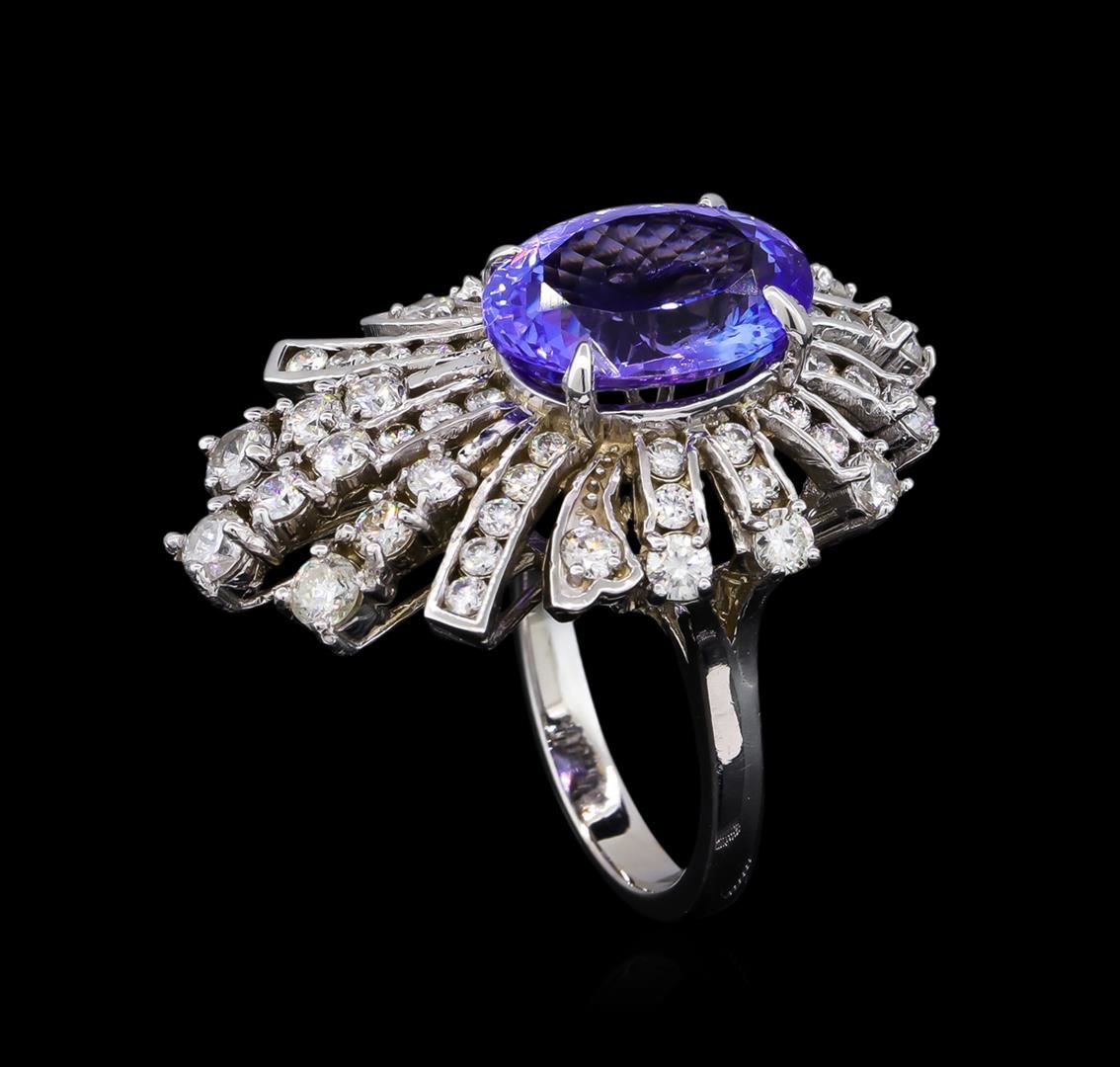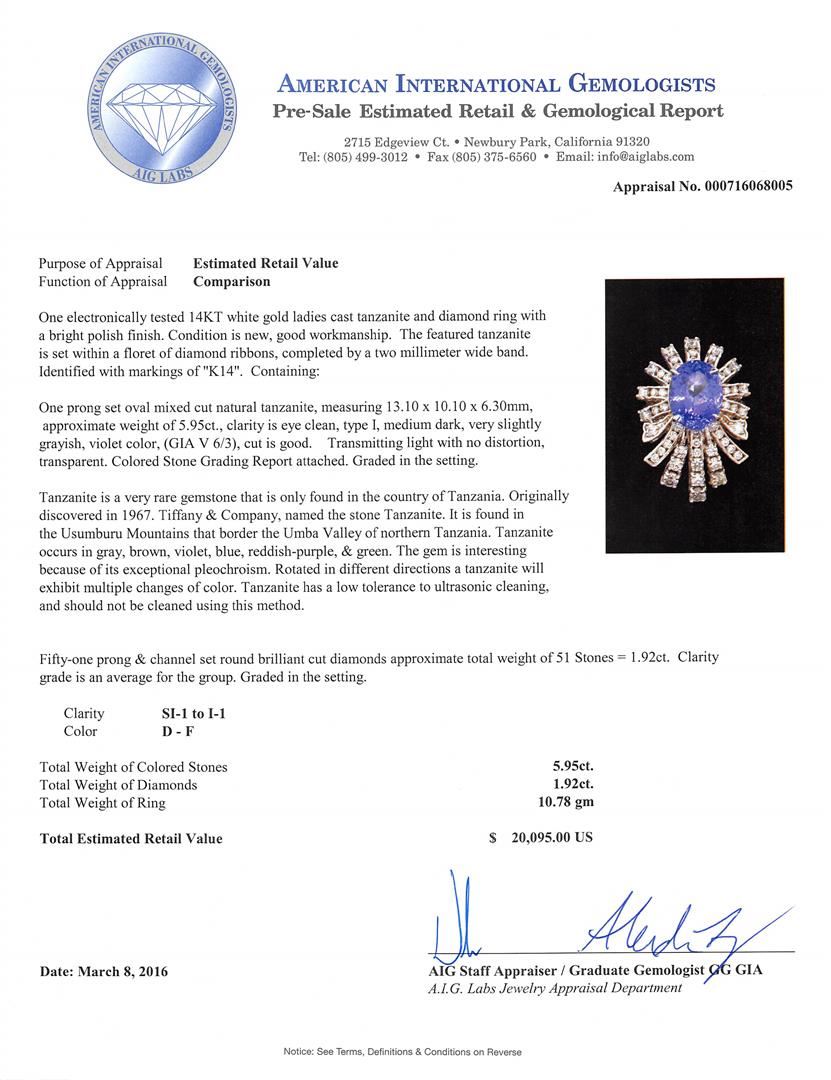 One electronically tested 14KT white gold ladies cast tanzanite and diamond ring with a bright polish finish. The featured tanzanite is set within a floret of diamond ribbons, completed by a two millimeter wide band. Identified with markings of "K14". Condition is new, good workmanship. Containing: One prong set oval mixed cut natural tanzanite, measuring 13.10 x 10.10 x 6.30mm, approximate weight of 5.95ct., clarity is eye clean, type I, medium dark, very slightly grayish, violet color, (GIA V 6/3), cut is good. Transmitting light with no distortion, transparent. Colored Stone Grading Report attached. Graded in the setting. Tanzanite is a very rare gemstone that is only found in the country of Tanzania. Originally discovered in 1967. Tiffany & Company, named the stone Tanzanite. It is found in the Usumburu Mountains that border the Umba Valley of northern Tanzania. Tanzanite occurs in gray, brown, violet, blue, reddish-purple, & green. The gem is interesting because of its exceptional pleochroism. Rotated in different directions a tanzanite will exhibit multiple changes of color. Tanzanite has a low tolerance to ultrasonic cleaning, and should not be cleaned using this method. Fifty-One prong & channel set round brilliant cut diamonds approximate total weight of 51 Stones = 1.92ct. Clarity grade is an average for the group. Graded in the setting. Clarity: SI-1 to I-1. Color: D - F. Total Weight of Colored Stones 5.95ct. Total Weight of Diamonds 1.92ct. Total Weight of Ring 10.78gm. AIG Appraised at $20,095.00.