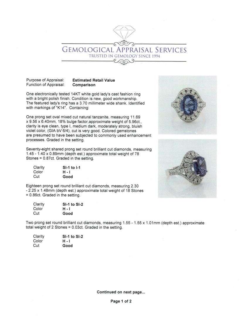 One electronically tested 14KT white gold lady's cast fashion ring with a bright polish finish. The featured lady's ring has a 3.70 millimeter wide shank. Identified with markings of "K14". Condition is new, good workmanship. Containing: One prong set oval mixed cut natural tanzanite, measuring 11.69 x 9.56 x 6.40mm, 18% bulge factor, approximate weight of 5.96ct., clarity is eye clean, type I, medium dark, moderately strong, bluish violet color, (GIA bV 6/4), cut is very good. Colored gemstones are presumed to have been subjected to commonly used enhancement processes. Graded in the setting. Seventy-Eight shared prong set round brilliant cut diamonds, measuring 1.45 - 1.40 x 0.89mm (depth est.) approximate total weight of 78 Stones = 0.87ct. Graded in the setting. Clarity: SI-1 to I-1. Color: H - I. Cut Good Eighteen prong set round brilliant cut diamonds, measuring 2.30 - 2.25 x 1.48mm (depth est.) approximate total weight of 18 Stones = 0.86ct. Graded in the setting. Clarity: SI-1 to SI-2. Color: H - I. Cut Good Two prong set round brilliant cut diamonds, measuring 1.55 - 1.55 x 1.01mm (depth est.) approximate total weight of 2 Stones = 0.03ct. Graded in the setting. Clarity: SI-1 to SI-2. Color: H - I. Cut Good. Total Weight of Colored Stones 5.96ct. Total Weight of Diamonds 1.76ct. Total Weight of Ring 8.90gm. GAS Appraised at $13,985.00.