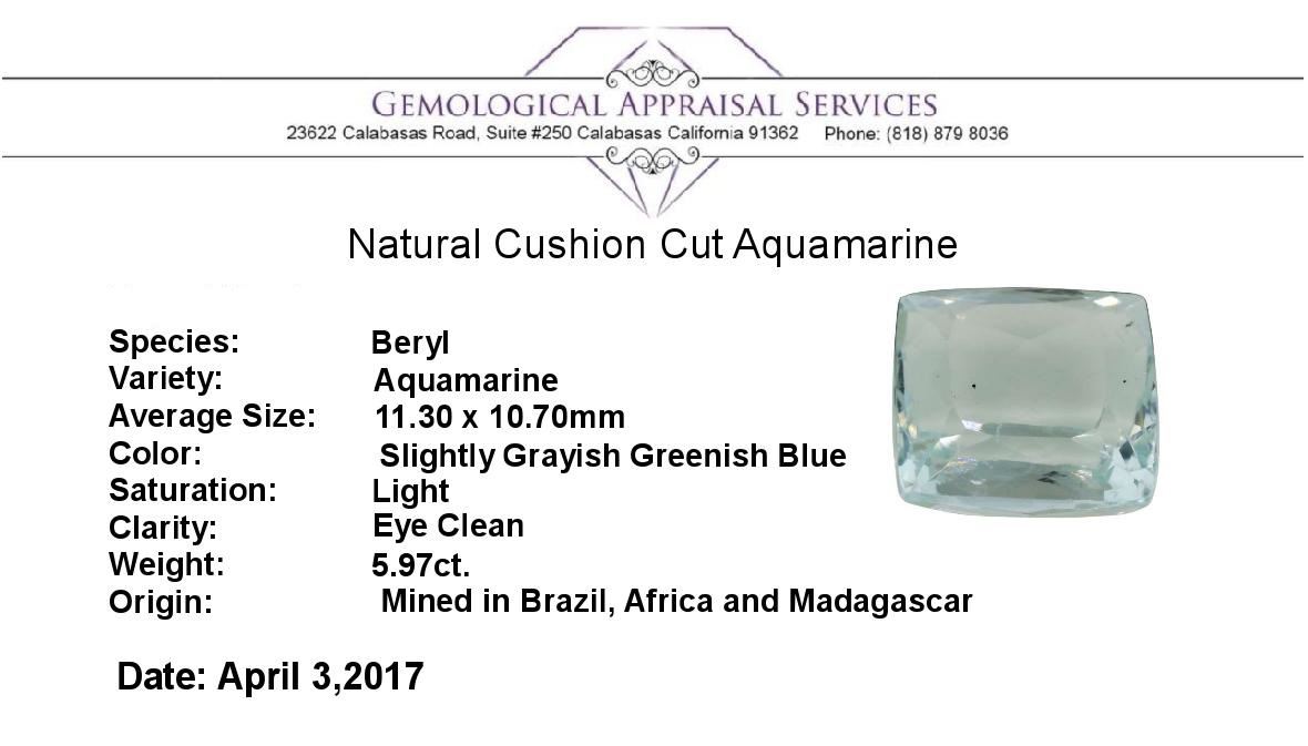 One natural cushion cut aquamarine with an exact weight of 5.97ct., clarity is eye clean, slightly grayish greenish blue, light. Gemological Appraisals Services estimates the retail value at $1880.55 GAS Appraised.