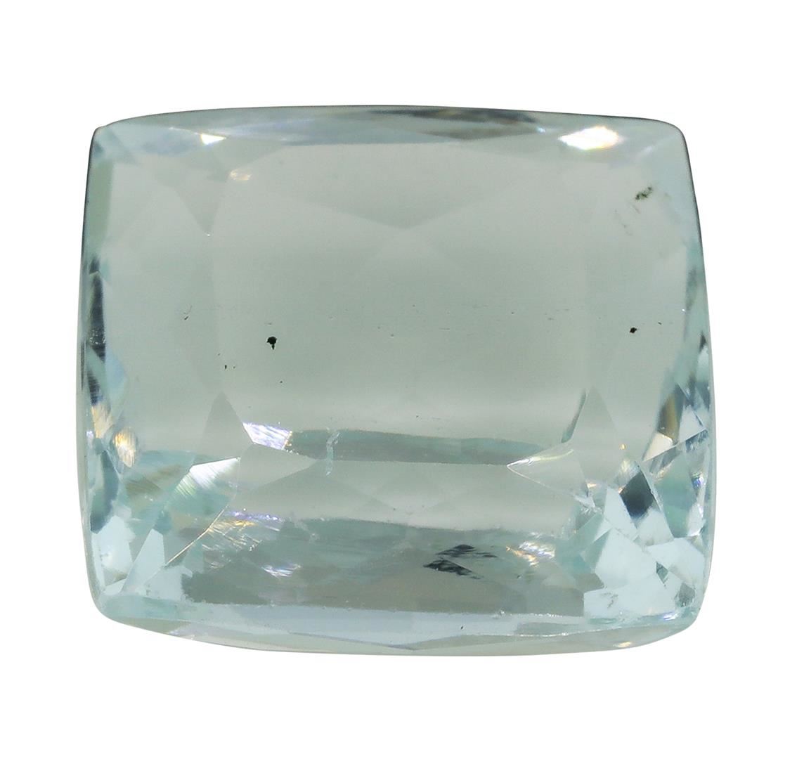 One natural cushion cut aquamarine with an exact weight of 5.97ct., clarity is eye clean, slightly grayish greenish blue, light. Gemological Appraisals Services estimates the retail value at $1880.55 GAS Appraised.