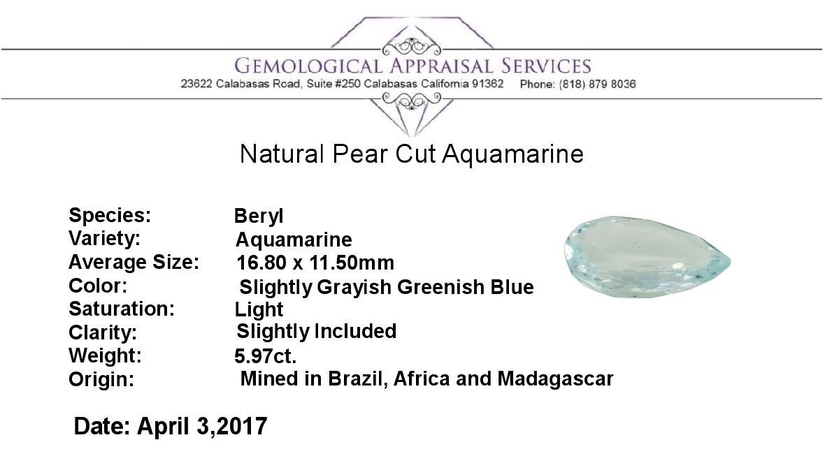 One natural pear cut aquamarine with an exact weight of 5.97ct., clarity is slightly included, slightly grayish greenish blue, light. Gemological Appraisals Services estimates the retail value at $1701.45 GAS Appraised.