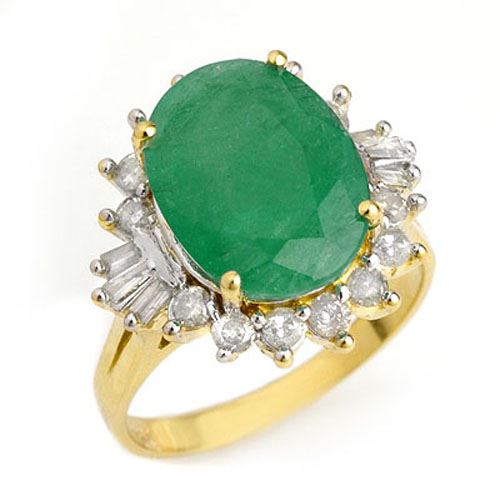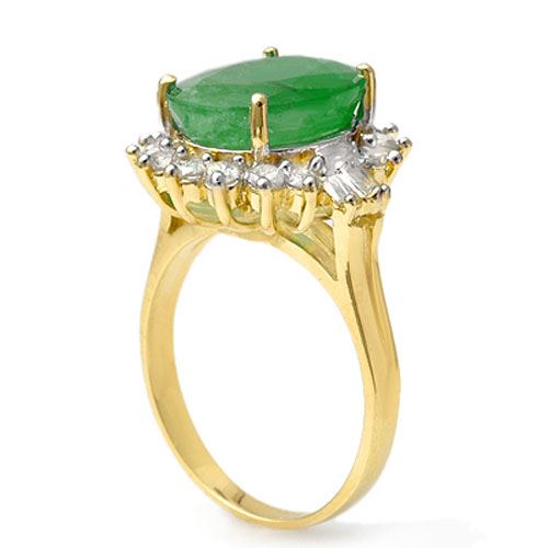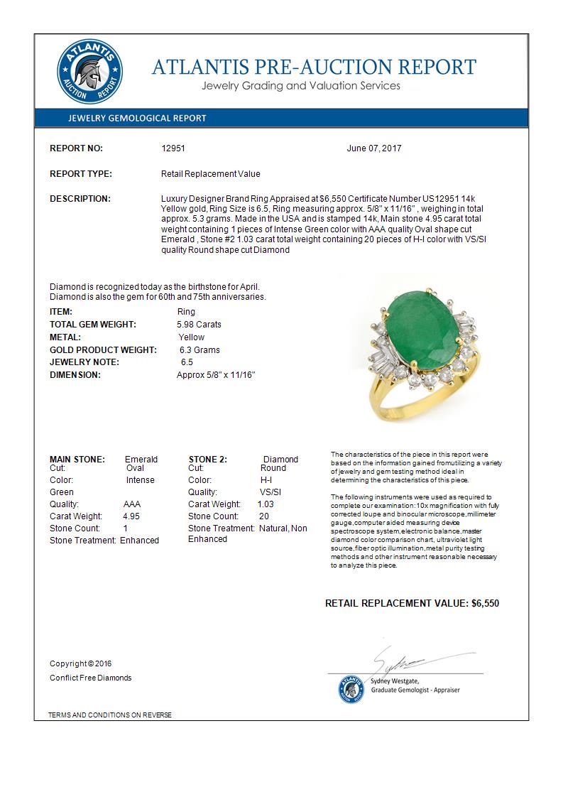 5.98 CTW Emerald & Diamond Ring 14K Yellow Gold ---- Luxury Designer Brand Ring Appraised Retail Price at $6,550 ---- SKU Number US12951 14k Yellow gold Ring Size is 6.5, Ring measuring approx. 5/8" x 11/16" , weighing in total approx. 5.3 grams. Made in the USA and is stamped 14k, Main stone 4.95 carat total weight containing 1 pieces of Intense Green color with AAA quality Oval shape cut Emerald , Stone #2 1.03 carat total weight containing 20 pieces of H-I color with VS/SI quality Round shape cut