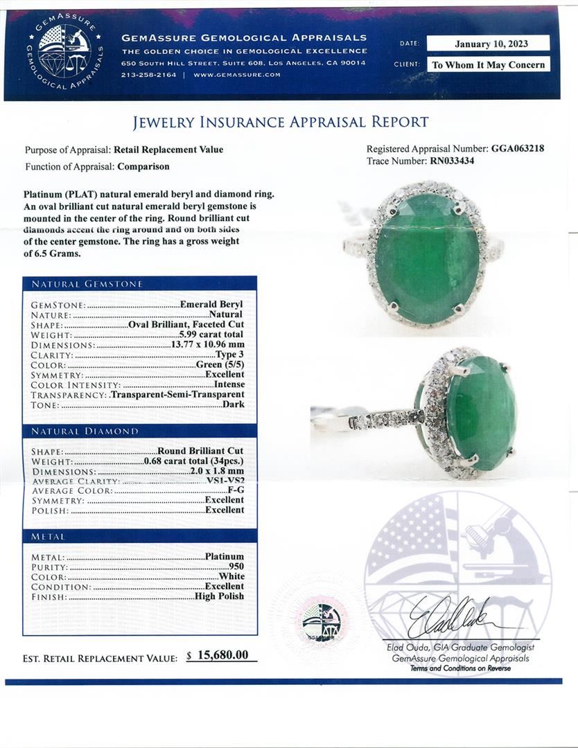 Platinum (PLAT) natural emerald beryl and diamond ring. An oval brilliant cut natural emerald beryl gemstone is mounted in the center of the ring. Round brilliant cut diamonds accent the ring around and on both stdes of the center gemstone. The ring has a