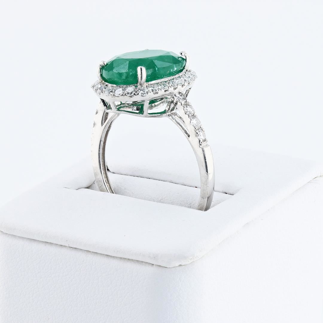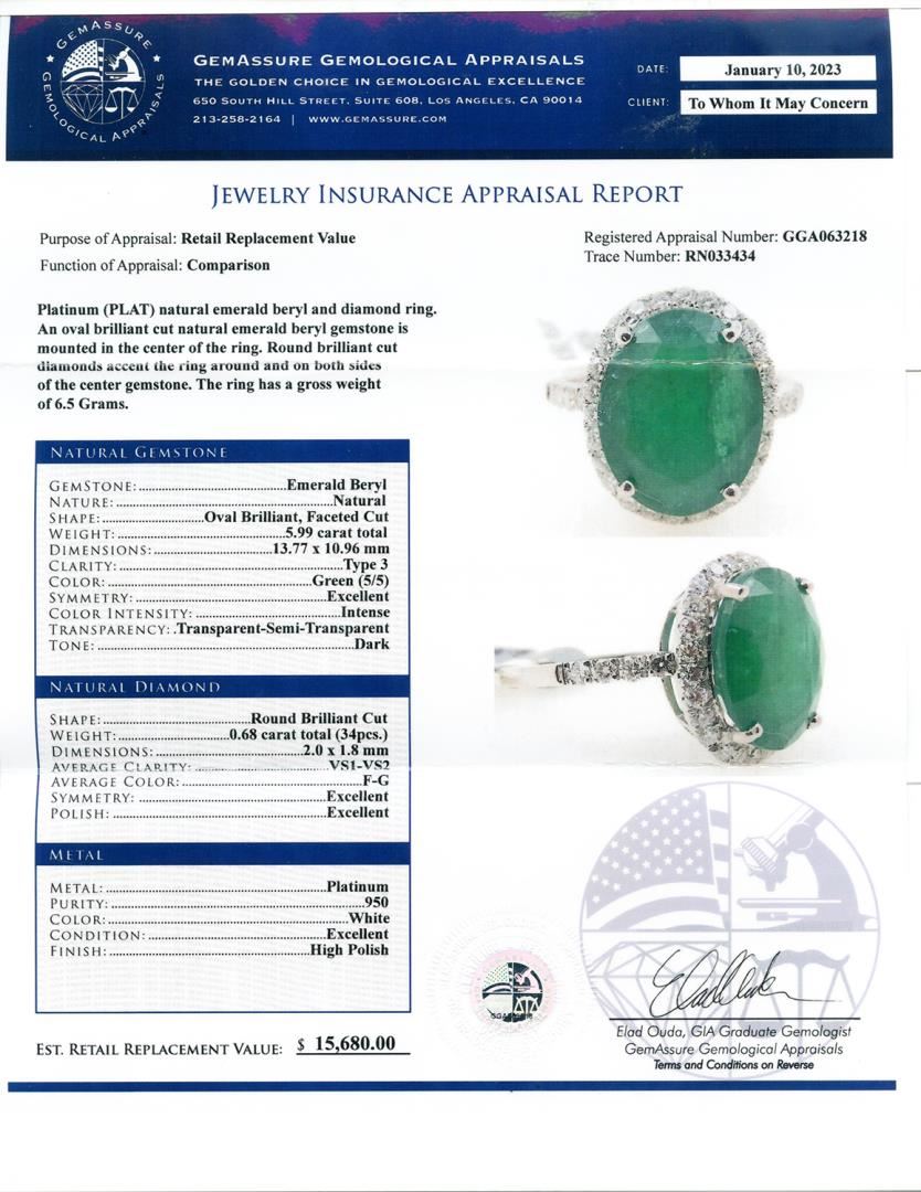 Platinum (PLAT) natural emerald beryl and diamond ring. An oval brilliant cut natural emerald beryl gemstone is mounted in the center of the ring. Round brilliant cut diamonds accent the ring around and on both stdes of the center gemstone. The ring has a gross weight of 6.5 Grams. #NATURAL GEMSTONE# GEMSTONE: Emerald Beryl NATURE: Natural SHAPE: Oval Brilliant, Faceted Cut WEIGHT: 5.99 carat total DIMENSIONS: 13.77 x 10.96mm CLARITY: Type 3 COLOR: Green (5/5) SYMMETRY: Excellent COLOR INTENSITY: Intense TRANSPARENCY: Transparent-Semi-Transparent TONE: Dark #NATURAL DIAMOND# SHAPE: Round Brilliant Cut WEIGHT: 0.68 carat total (34pcs.) DIMENSIONS: 2.0 x 1.8mm AVERAGE CLARITY: VS1-VS2 AVERAGE COLOR: F-G SYMMETRY: Excellent POLISH: Excellent #METAL# METAL: Platinum PURITY: 950 COLOR: White CONDITION: Excellent FINISH: High Polish