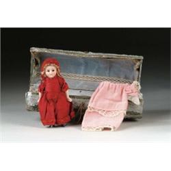 5” ALL BISQUE. A charming close-mouth, all bisque possibly by Kestner, this stiff-neck, blue booted, with brown glass eyed with feathered eyebrows is in her original outfit and comes with a second pink cotton outfit. She is contained within a papier-mâché log. CONDITION: Clothing has not been removed for full inspection so as not to damage originality of clothing. Minute nose chip; otherwise very good. JL 1-2398 (300-400)