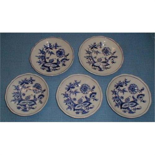 These are 5 late 19th century BLUE ONION pattern sauce plates....3 are 5 1/4" in diameter and are marked, MEISSEN CAULDON ENGLAND, and 2 are 5 7/8" in diameter and are marked, BLUE MEISSEN ENGLAND. They are all in perfect condition, no chips, cracks, breaks or repairs.