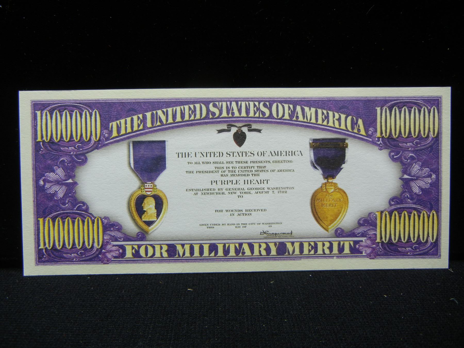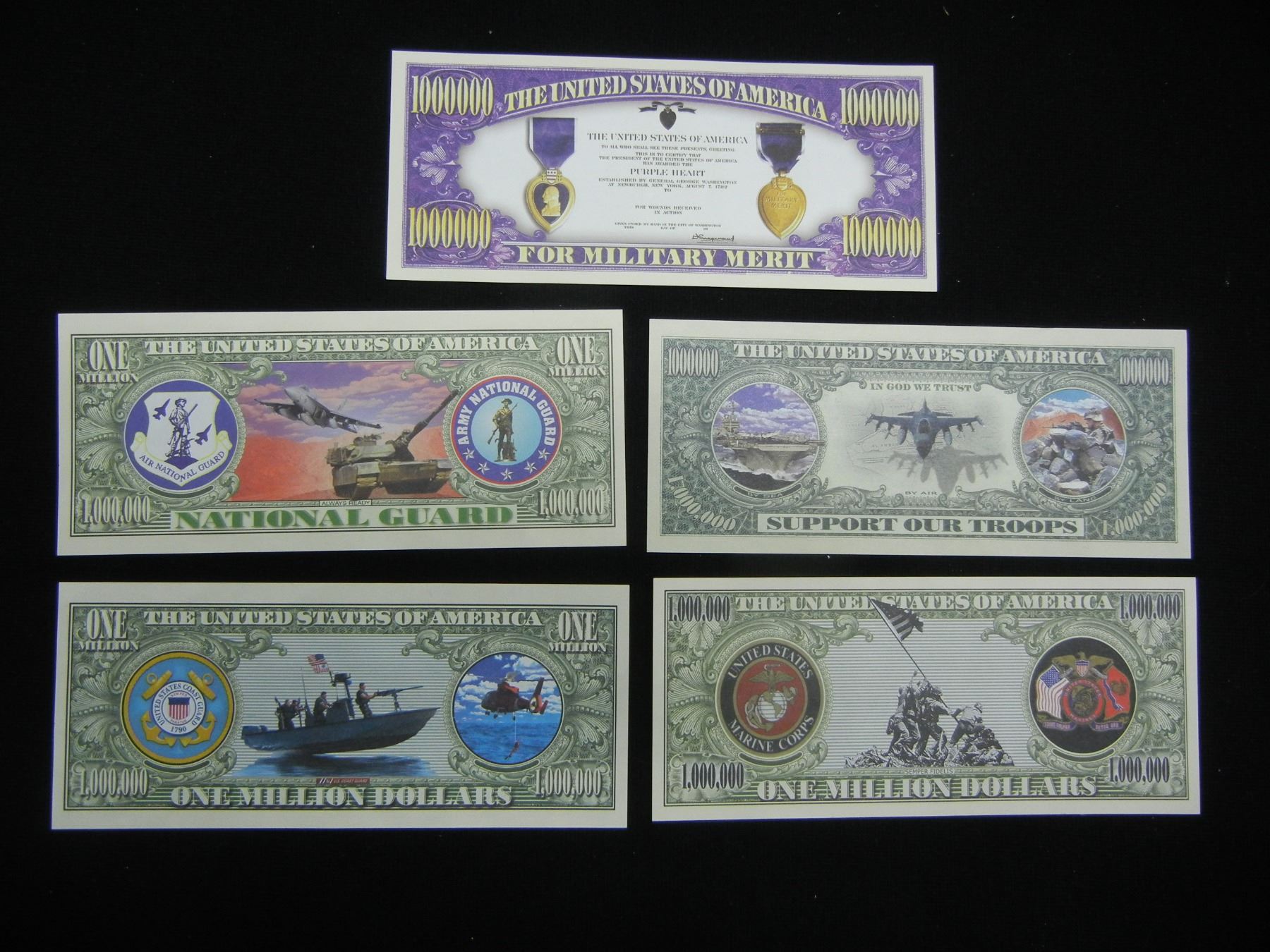 (5) ARMED FORCES (MARINES/COAST GUARD/IRAQI FREEDOM/NATL GUARD & PURPLE HEART), MILLION DOLLAR NOTES, NOT LEGAL TENDER