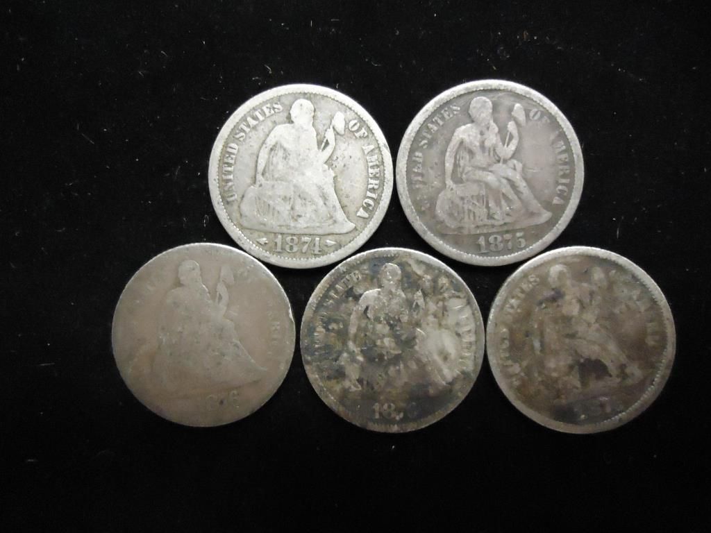 5 ASSORTED 1870'S SEATED LIBERTY DIMES