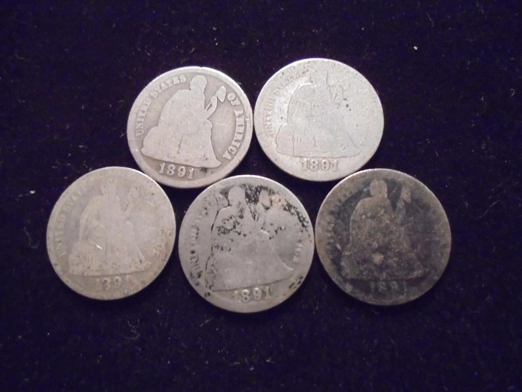 5 ASSORTED 1891 SEATED LIBERTY DIMES