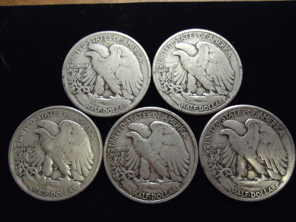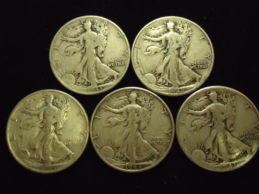 5 ASSORTED 1940'S WALKING LIBERTY HALF DOLLARS