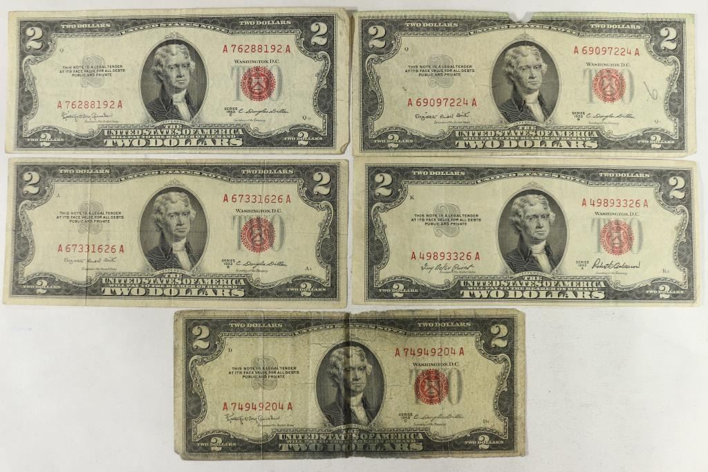 5 ASSORTED 1953 $2 US NOTES RED SEALS