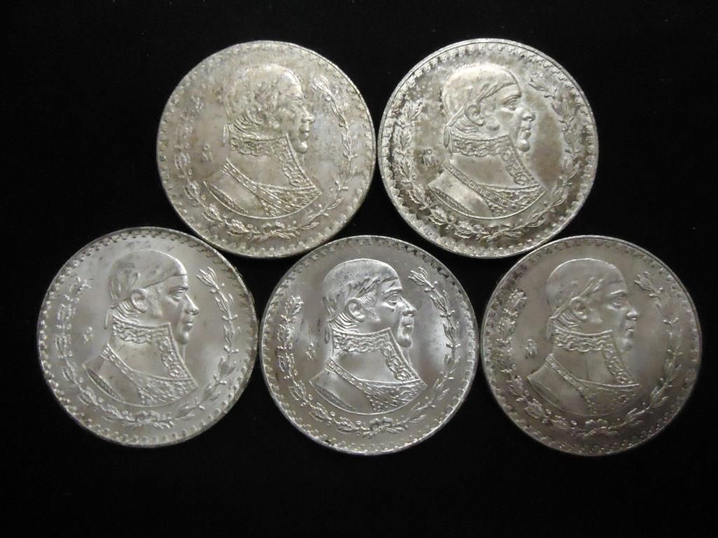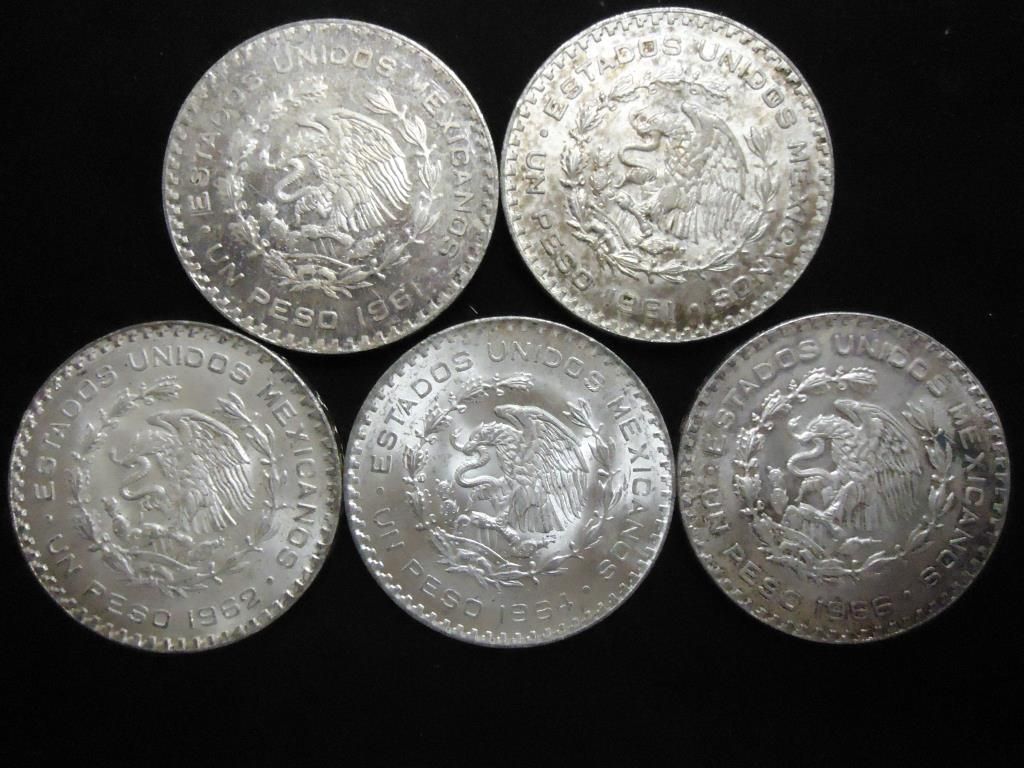 5 ASSORTED 1960'S MEXICO SILVER PESOS
