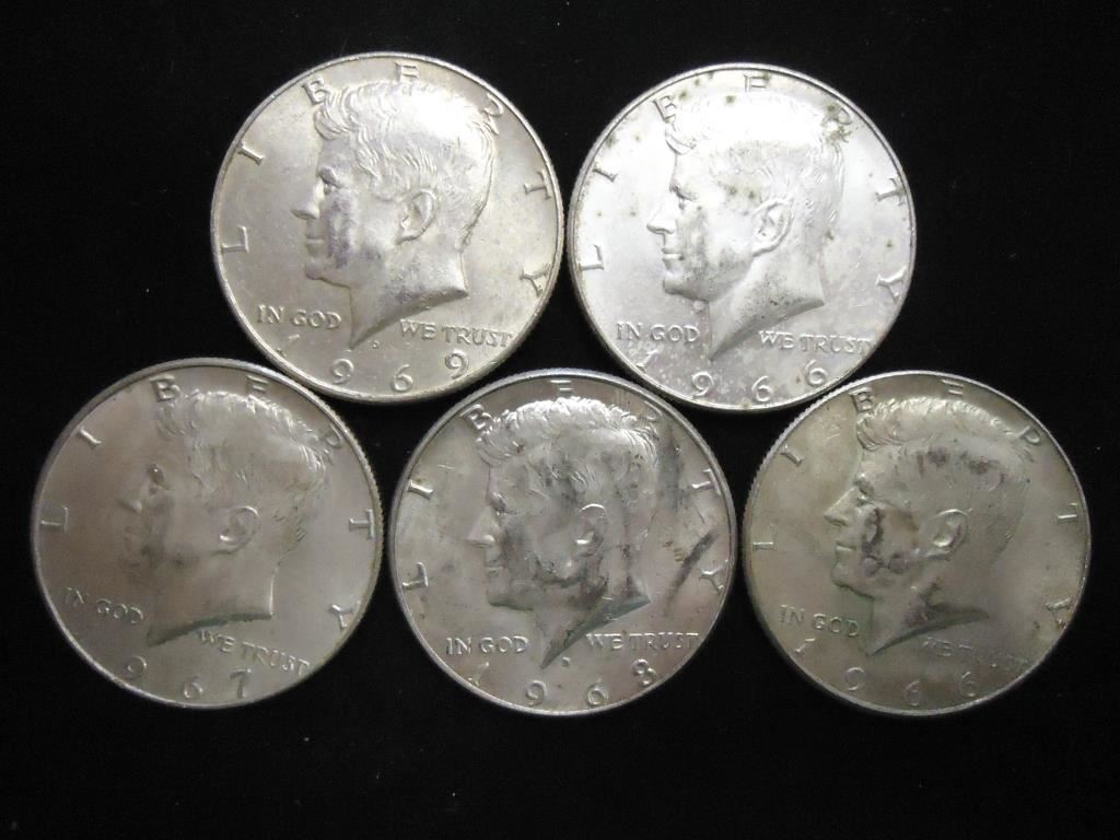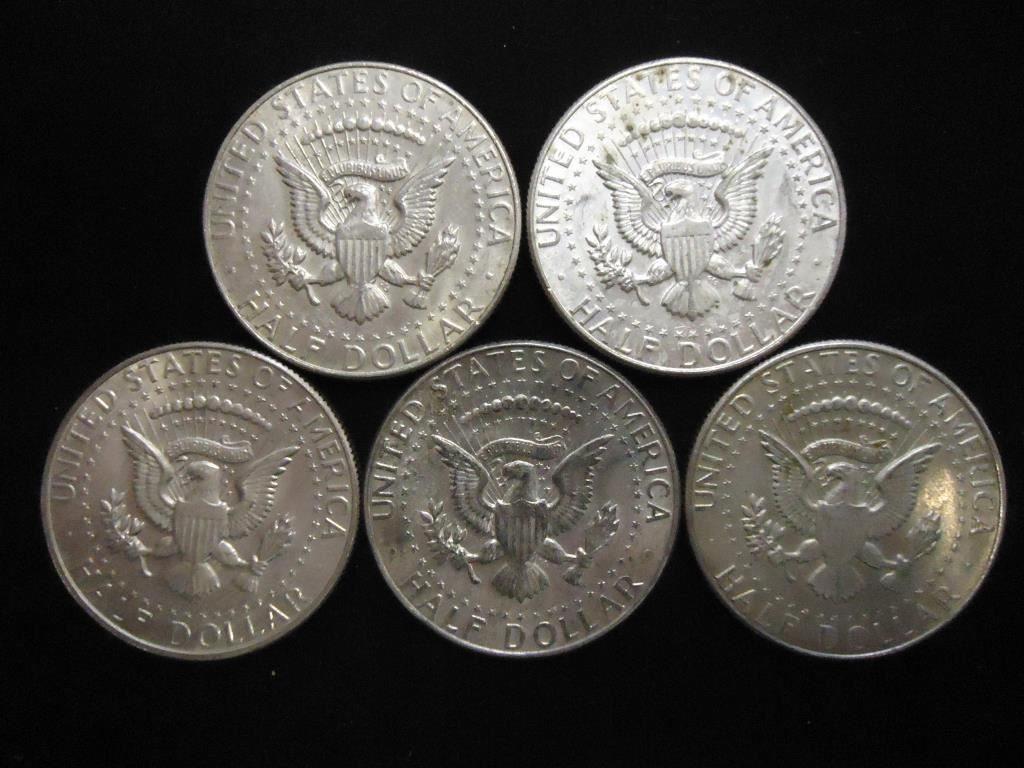 5 ASSORTED 40% SILVER KENNEDY HALF DOLLARS