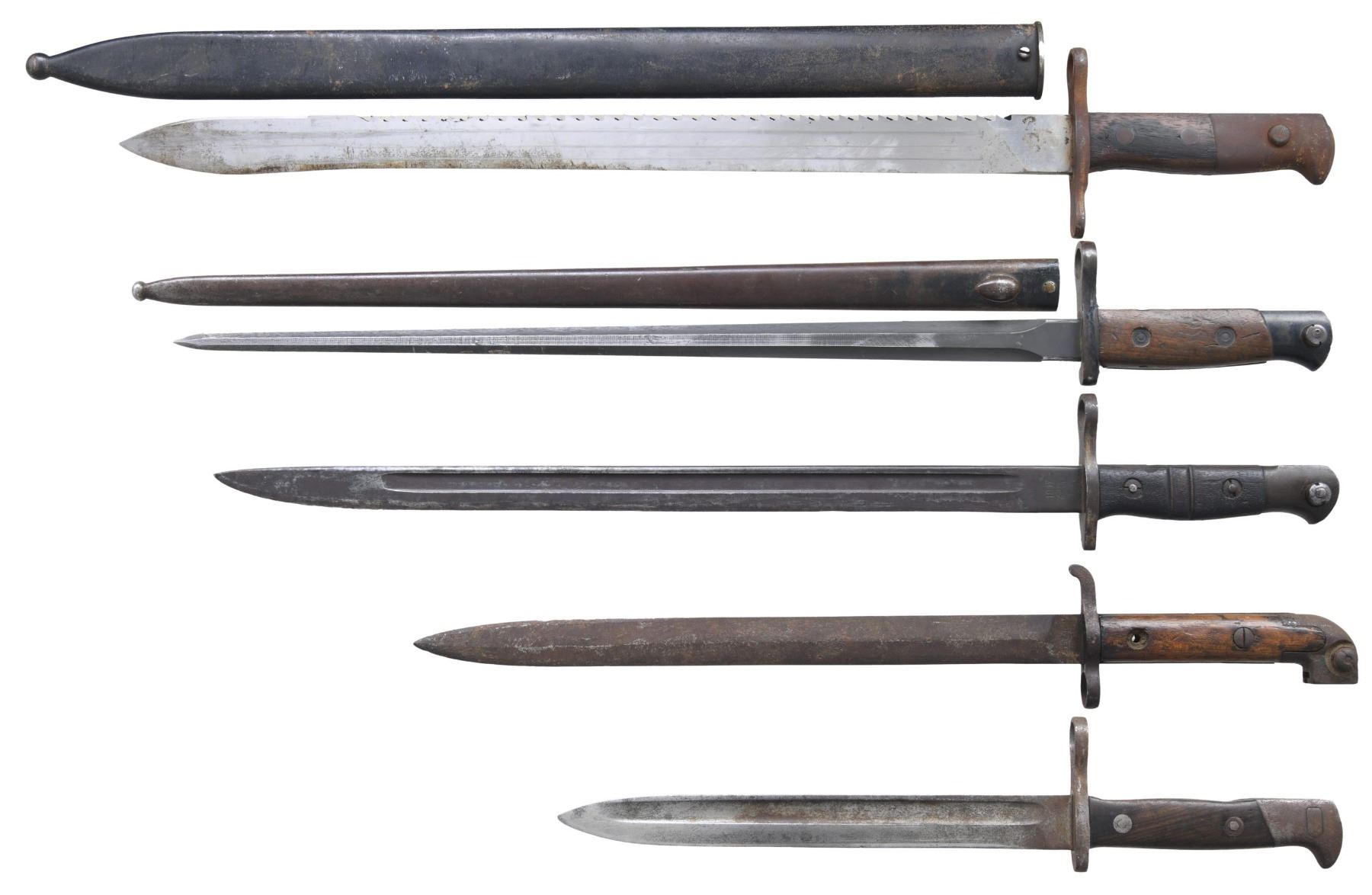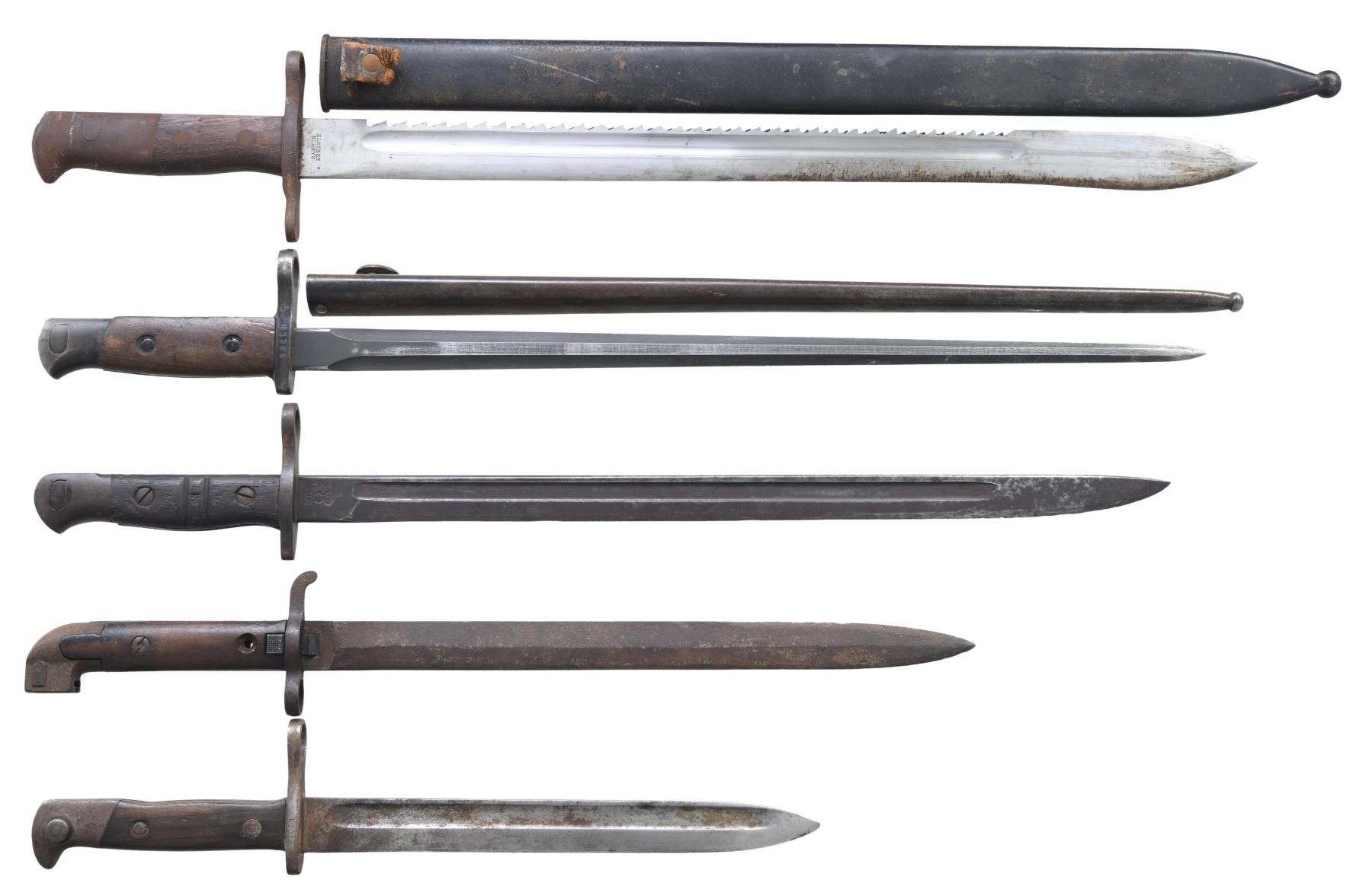 No.1: Swiss Model 1911 Pioneer Bayonet. 18 7/8" bright saw-back blade w/ fuller on the right side only. 24" overall. Marked on right ricasso "ELSENER SCHWYZ". Straight steel crossguard w/ muzzle ring. Smooth walnut grips retained by two rivets. This bayonet fits the model 1911 Schmidt-Rubin carbine. Steel scabbard w/ ball tip. CONDITION: bayonet blade has been sharpened w/ light wear & staining. Saw-back appears to be reasonably sharp. Balance of metal has turned a dark patina w/ oxidation & very fine pitting throughout. Grips have light wear & scattered handling marks. Scabbard is turning gray & patina. No.2: Belgian Model 1916 Cruciform Bayonet. 17 3/4" blued blade. 22 1/2" overall. Bayonet for the Model 1889 Mauser rifle is marked only w/ S# on crossguard. Crossguard has muzzle ring. Smooth walnut grips secured by two rivets. Matching blued steel scabbard w/ ball tip. CONDITION: bayonet has thinning finish w/ light wear. Grips have light wear & scattered handling marks throughout. Scabbard has dents & scratches w/ handling marks throughout. No.3: Swedish M19 Bayonet. 12 3/4" blade w/ false edge. 17 7/8" overall. Blade is marked on right ricasso "crown over anchor / EJ / AB". Smooth hardwood grips retained by two screws. Front screw is not present. CONDITION: blade is heavily oxidized w/ wear & pitting throughout. Notable chipping on the forward end of the false edge. Balance of metal has turned overall patina. Grips have wear, cracking & staining. No.4: US Remington Model 1917 Bayonet. 16 7/8" fullered blade. 21 5/8" overall. Blade is marked on left ricasso "1917" & encircled "REMINGTON". Marked on right ricasso "flaming bomb / U.S. / eagle head / 25 / acceptance mark". CONDITION: metal parts show traces of original blue w/ wear, light oxidation & fine pitting turning overall patina. Sharpened edge has tiny chips missing at forward end. Grips have wear, staining & chipping. No.5: Austrian Model 1895 Mannlicher Bayonet. 9 3/4" bright blade. 14 5/8" overall. Bayonet has distinctive profiled grip. Bayonet is marked only w/ S# on crossguard. Smooth walnut grips secured by two rivets. CONDITION: metal parts are turning gray & patina w/ extensive light oxidation & fine pitting. Blade has been sharpened. Grips have moderate wear & handling marks. (02-23850/RW). NON-GUN. $250-400.