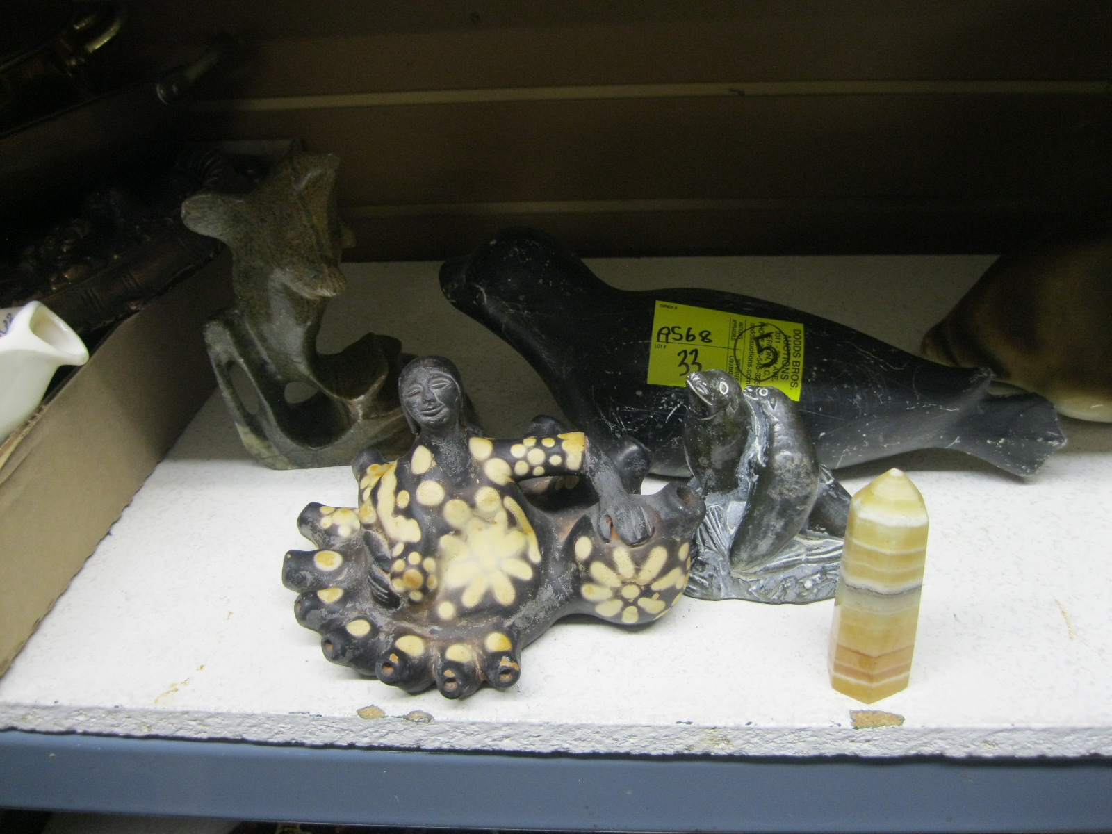 5 ASST. ITEMS - CANDLEHOLDER, SEAL SOAPSTONE CARVING, ETC.
