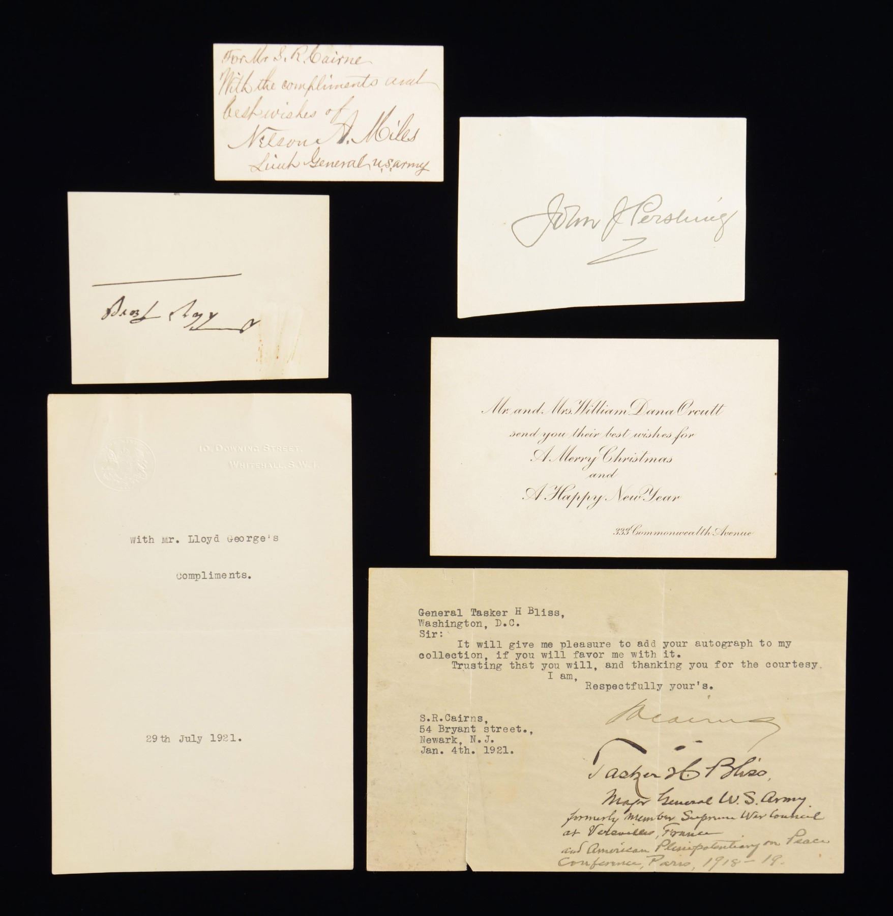 FIGURES. 1) A 4 1/2" x 3" piece of paper with the original signature of John J Pershing. Pershing was a world-famous military figure and leader of the American forces in Europe during WWI. "Black Jack" Pershing was one of the few Americans to ever hold the rank of "General of the Army". 2) A 3 1/2" x 2" card with the original signature of Lieutenant General Nelson A. Miles. Miles held the title of "Commanding General of the United States Army" toward the end of his career. He fought bravely through the Civil War, earning the Congressional Medal of Honor for gallantry at the Battle of Chancellorsville. He fought in many Indian War campaigns and led the Army during the Spanish American War. 3) A 3 3/8" x 5 3/8" card with the signature of Major General Hugh Lenox Scott. Scott served with distinction on the Western Frontier after graduating from West Point in 1876. Most of his service was with the 7th Cavalry, and he was charged with marking the grave sights of General Custer's men that were killed at the Little Big Horn. 4) A 4" x nearly 3" piece of paper signed by David Lloyd George, the Prime Minister of England. The paper is accompanied by a small piece of 7" x 5" stationary with the impressed heading "10. DOWNING STREET. WHITEHALL, S.W.1." The stationery is dated "29th July 1921". 5) A 7 1/2" x 5" piece of paper signed by Major General Tasker H. Bliss. Bliss served in many capacities during the Indian War period through WWI. He is most remembered as a member of the Supreme War Council at Versailles and American Plenipotentiary at the Paris Peace Conference of 1918-19. CONDITION: all items generally show light wear. All signatures are clear and easily read. Most of the paper has slightly yellowed. (02-23298-7/BF). $150-300..