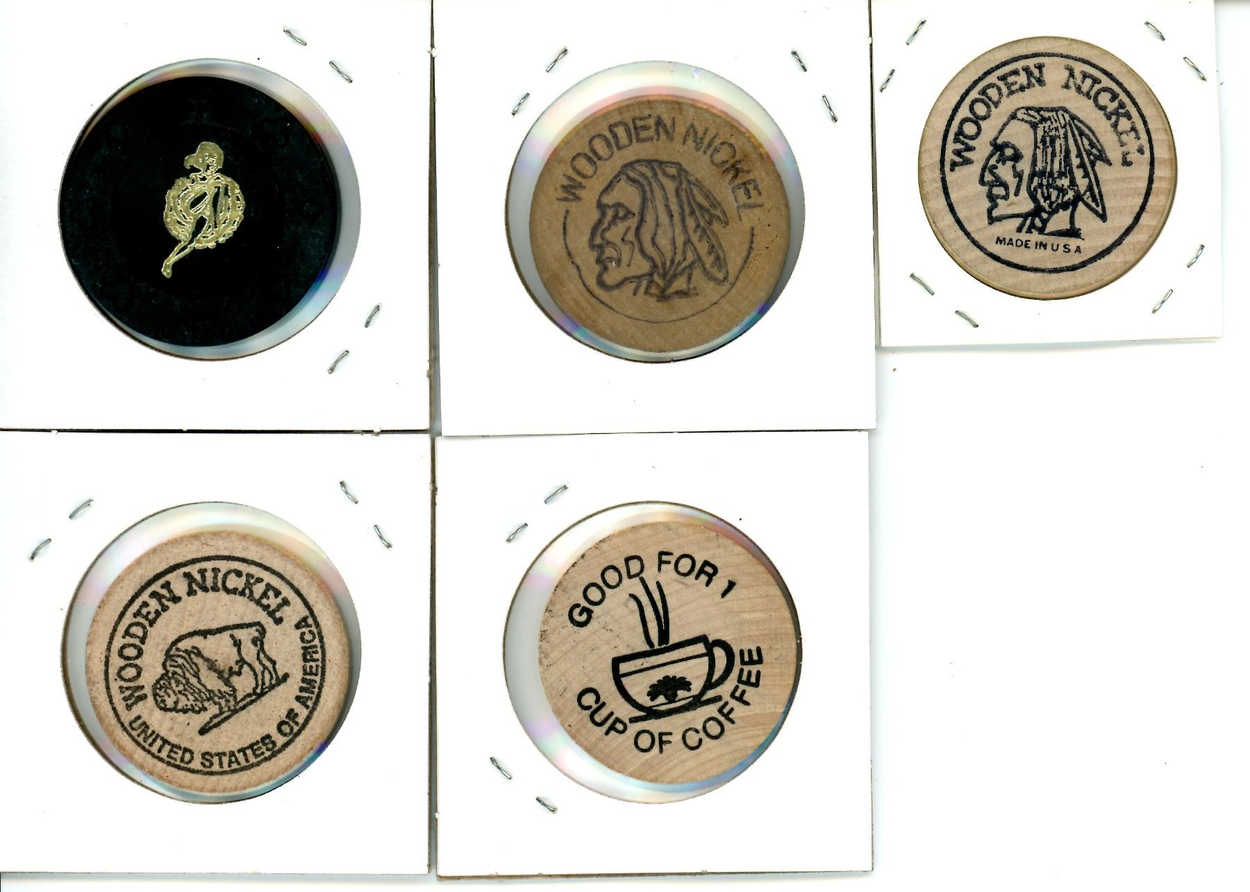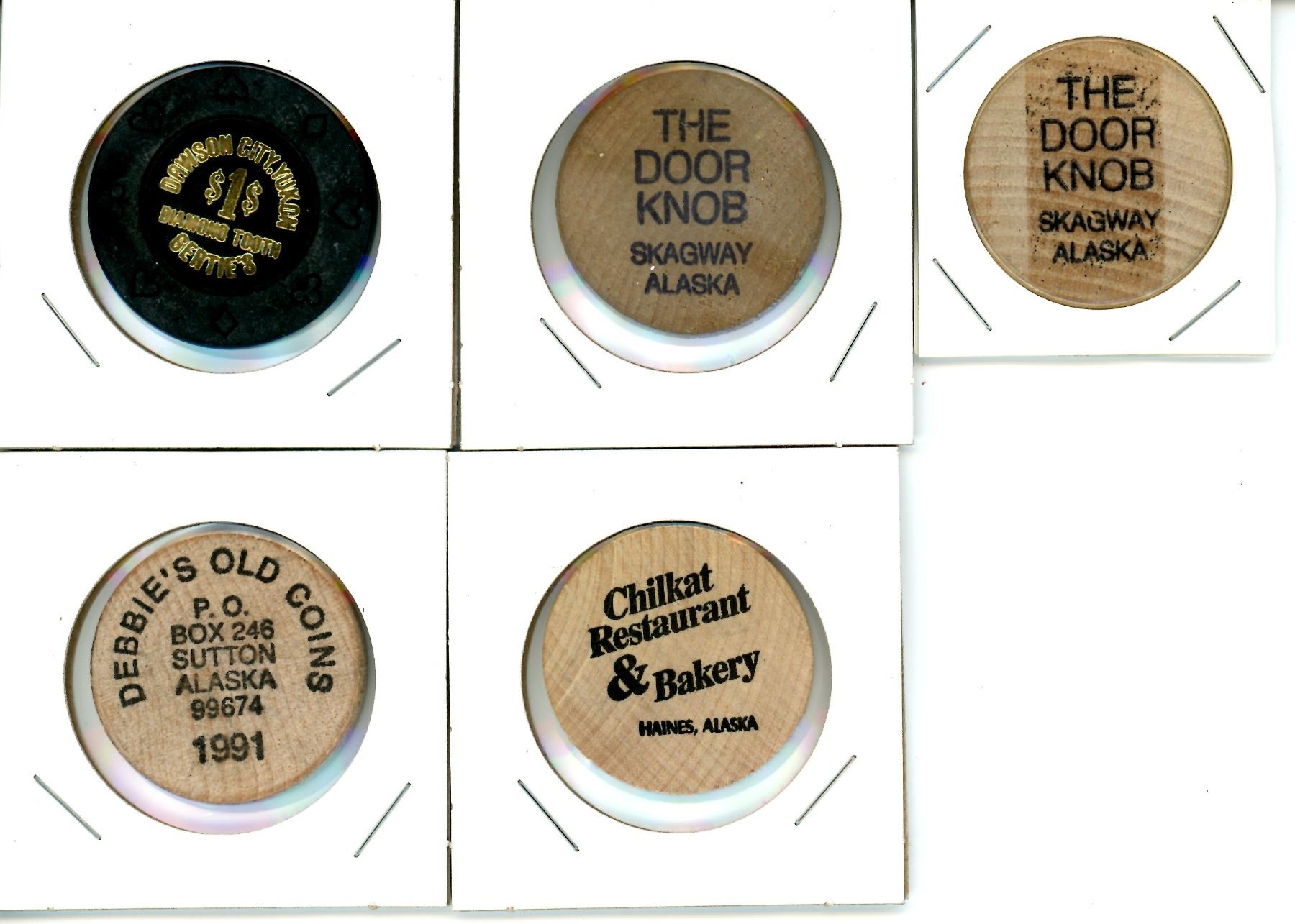 5 Alaska Tokens - Wooden Nickels, Poker Chip