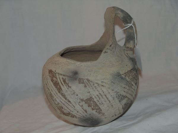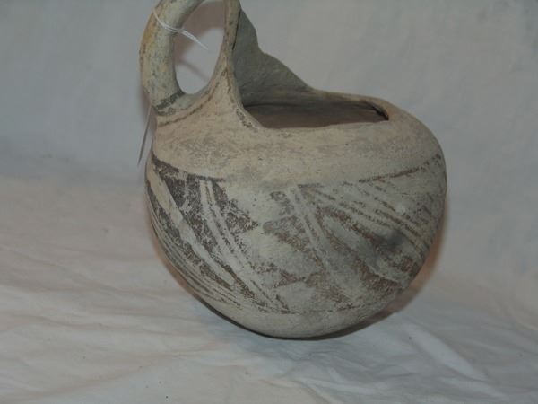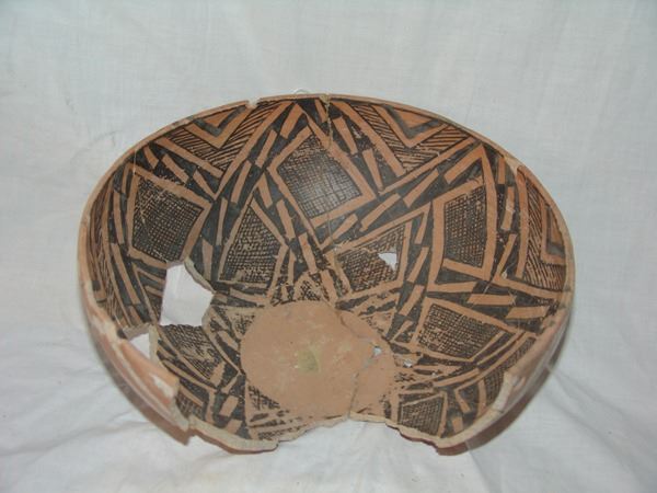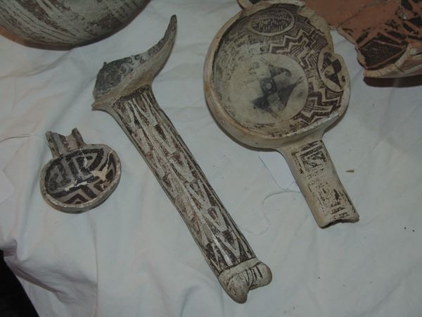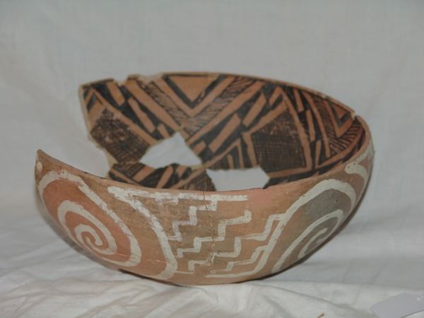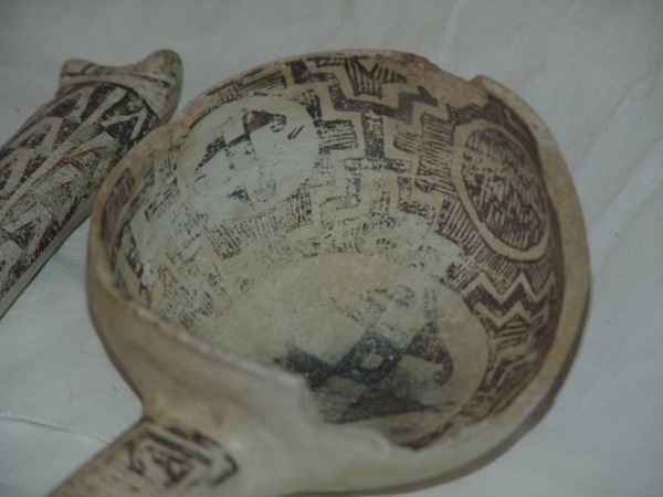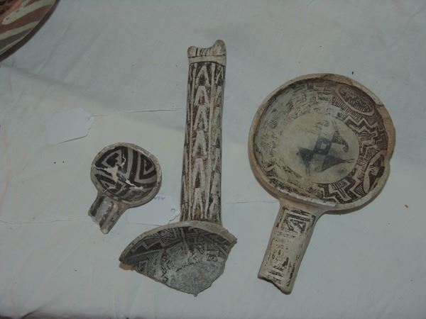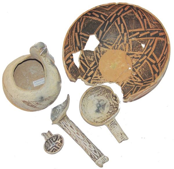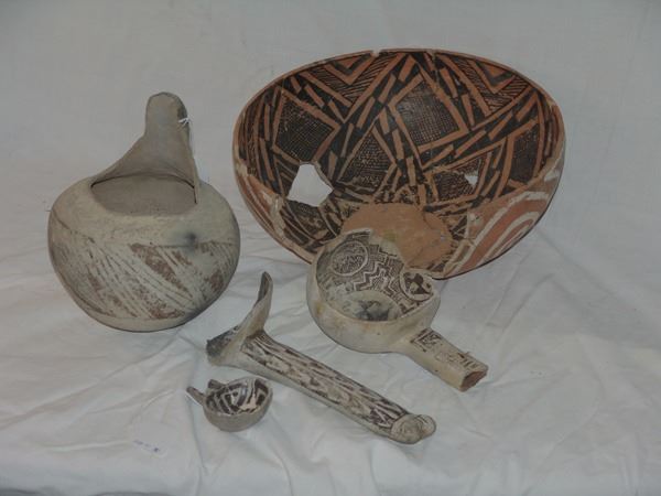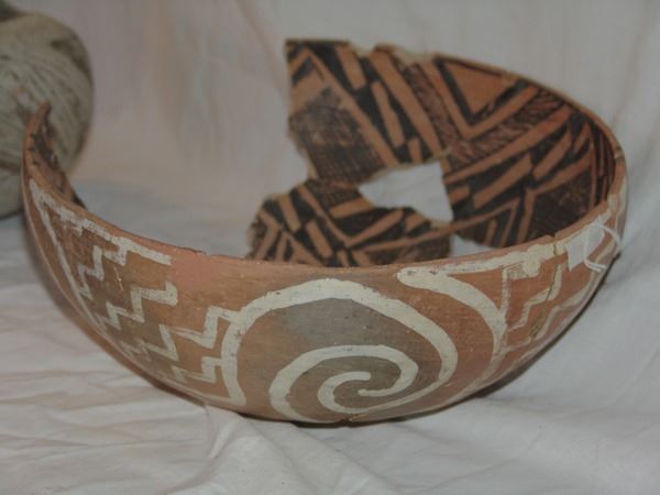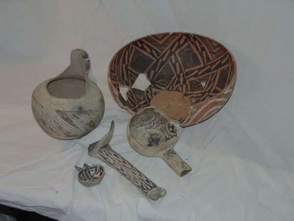 Includes a huge St. John polychrome bowl, three black-on-white ladles, and a black-on-white pitcher. These are all incomplete item- the bowl has some glued repairs, possibly some restoration.