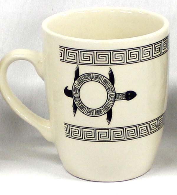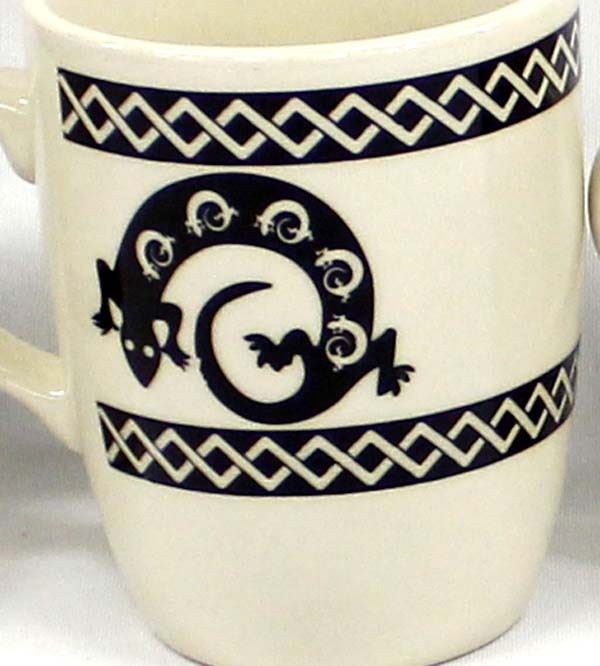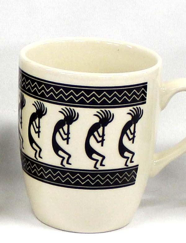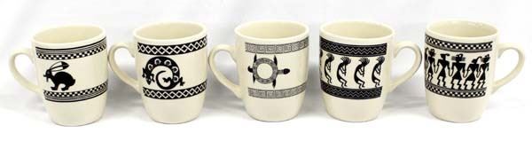 Set of 5 Anasazi Traders Mimbres Designed Black on White Ceramic Cups, made in Ecuador, measure 4.25'' x 4.75'', includes Dancers, Rabbit, Turtle, Lizard, and Kokopelli