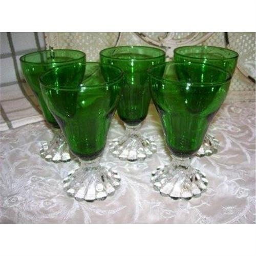 Set of 5 beautiful deep forest green colored juice stems by Anchor Hocking. This pattern is called "Inspiration", But also known as "Berwick" and "Boopie". These were to go with the "Bubble" line produced from 1941 - 1968. The top green bowl is attached to a clear swirled stem. The glasses measure 4 1/2" tall and 2 5/8" wide at the mouth. All five are in excellent condition! No chips or scratches.