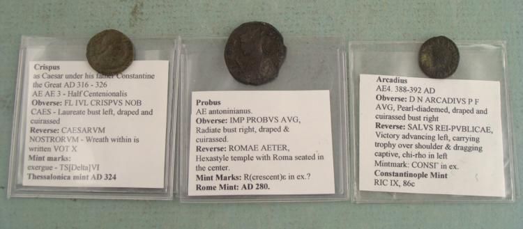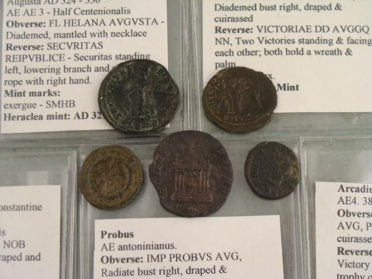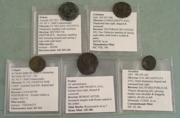 Lot of 5 ancient Roman coins, each in a plastic sleeve with description * * ConstansCrispus Helena ProbusArcadius Size range: 7- 20 mm in diameter *