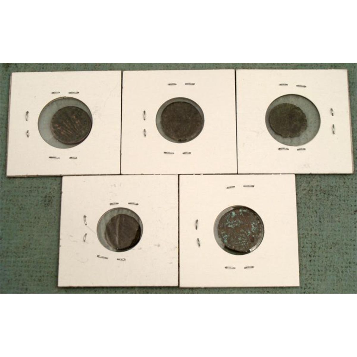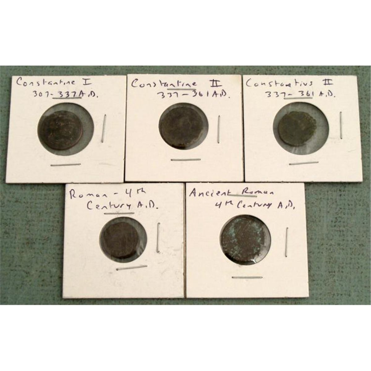 Lot of 5 ancient Roman coins * Constantine I (307-337 A.D.)Constantine II (337-361 A.D.)(2) Roman 4th Century A.D. * Size: 5/8" to 3/4" in diameter *