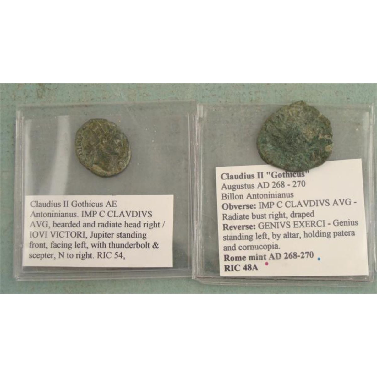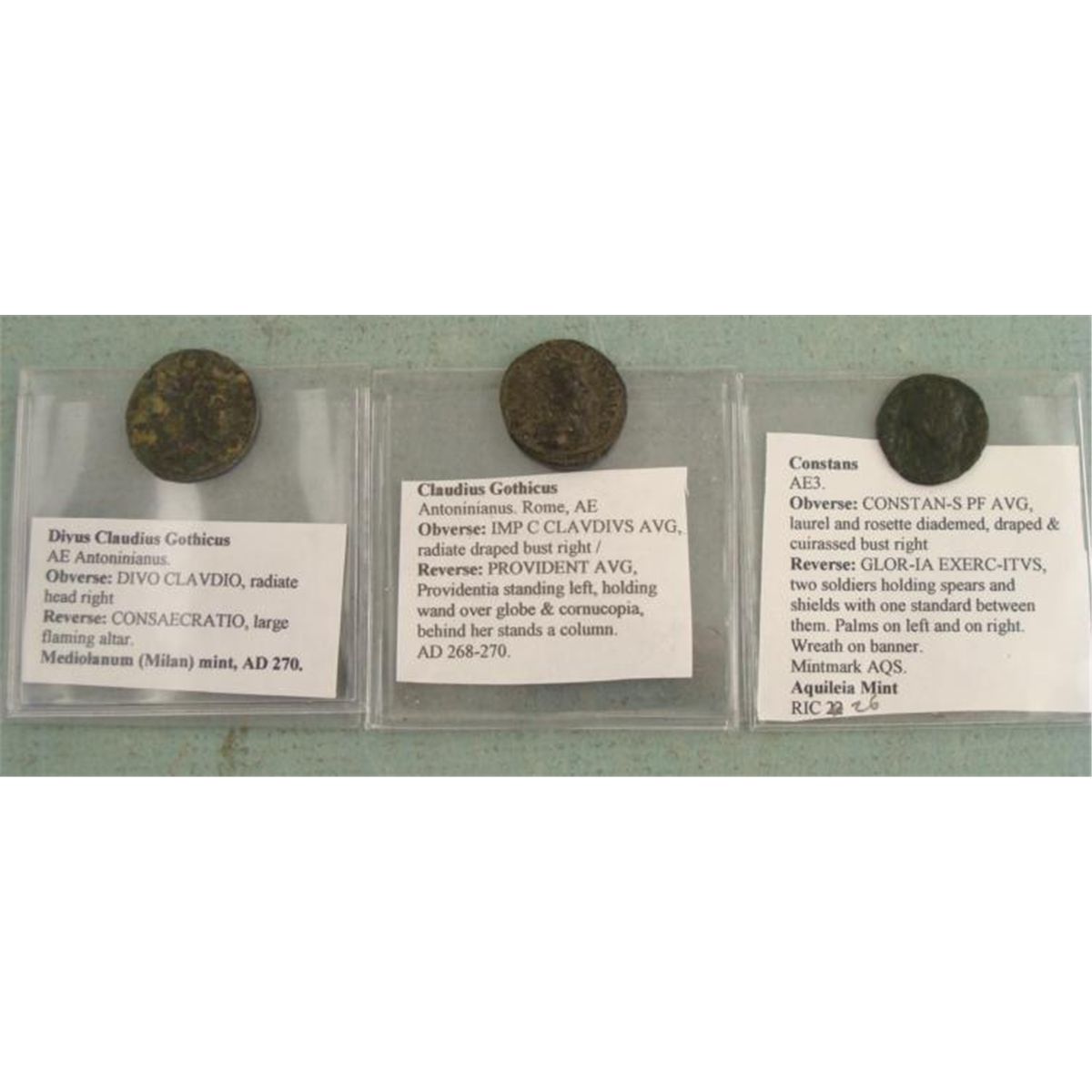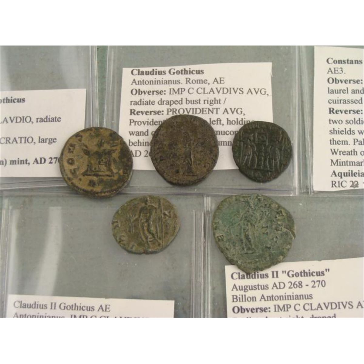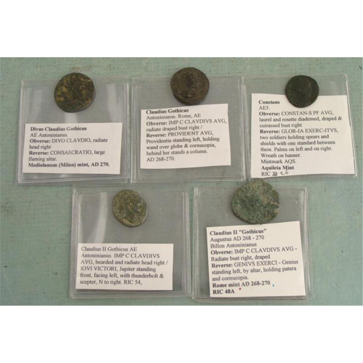 Lot of 5 ancient Roman coins, each in a plastic sleeve with description * * Claudius GothicusClaudius II GothicusClaudius II Gothicus AEDivus Claudius GothicusConstans Size range: 15- 20 mm in diameter *